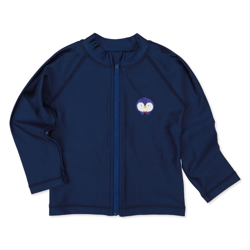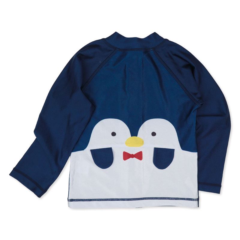 赤ちゃん本舗オリジナルデザインの長袖ラッシュガードです。バックスタイルのペンギンの立体モチーフがかわいいアイテムです。スイムパンツとセットアップすることも可能です。UVカット加工素材で、紫外線防止にぴったりの長袖タイプです。海、川、山のアウトドアやおうちプールにも使えます。