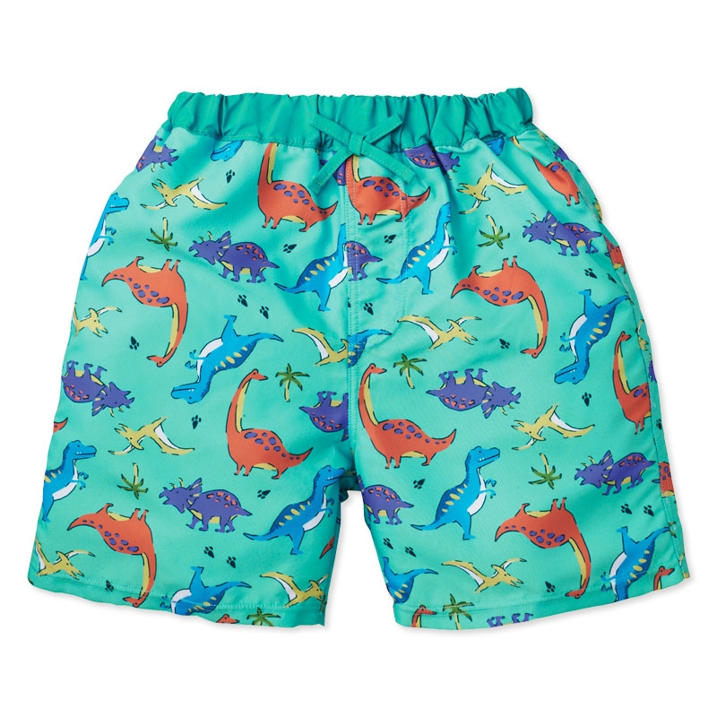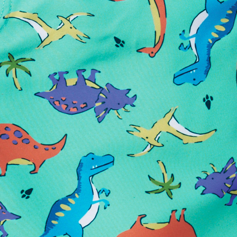 赤ちゃん本舗オリジナルデザインの総柄サーフパンツです。男の子が大好きな恐竜を総柄にしたサーフパンツです。ポップなグリーンカラーの総柄です。恐竜の立体モチーフもかわいいポイントです。UVカット素材を使用しています。
