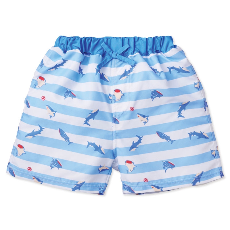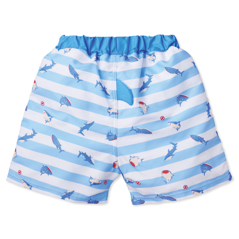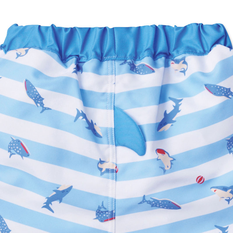赤ちゃん本舗オリジナルデザインの総柄サーフパンツです。す。サメ達が泳いで遊んでいる総柄にお尻にはサメのヒレをイメージした立体モチーフがついています。UVカット素材を使用しています。
