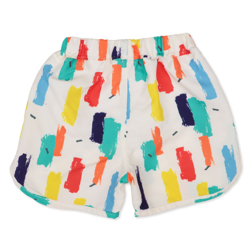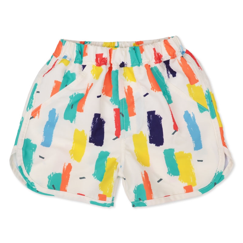 赤ちゃん本舗オリジナルデザインのボードショーツです。幾何学総柄にポップなカラーリングがおしゃれなデザイン。海やプール、アウトドアにも使えます。UVカット素材を使用しています。