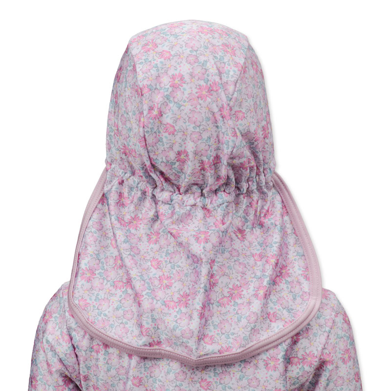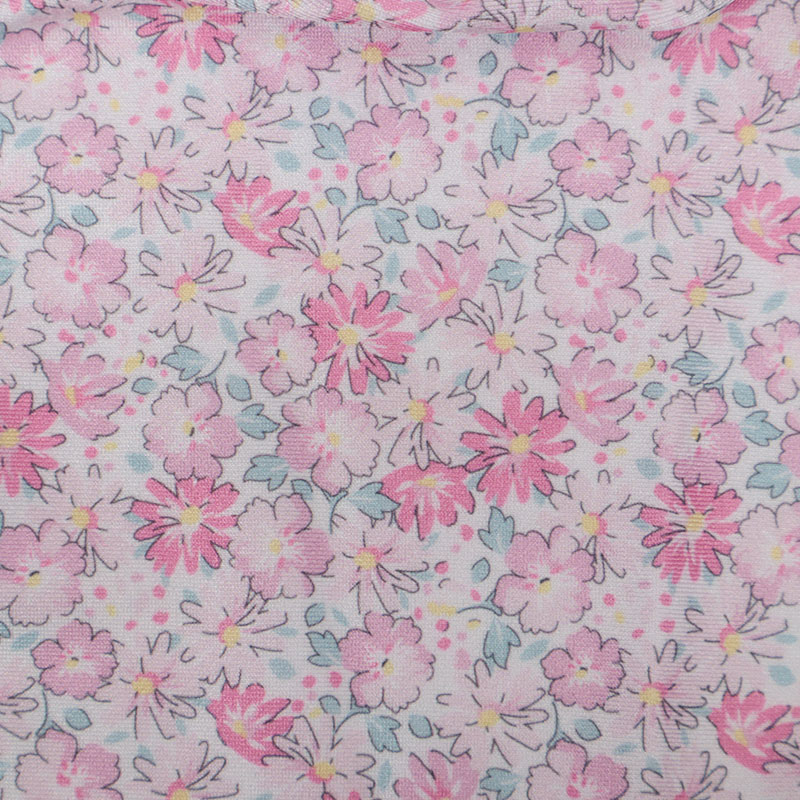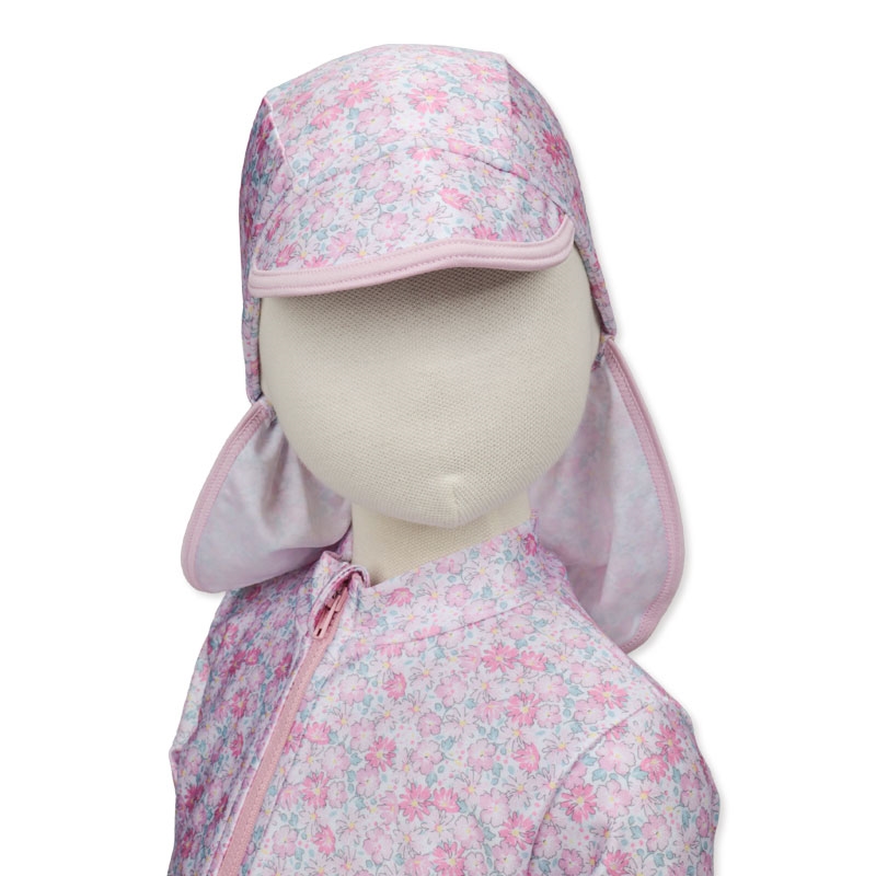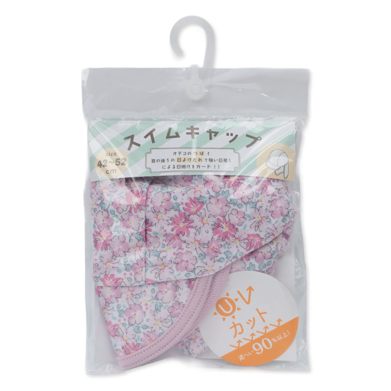 赤ちゃん本舗オリジナルデザインのスイムキャップです。たれつき、かわいい花柄総柄デザインもポイントです。後頭部にゴムがはいっており、長く使えます。UVカット素材を使用しています。