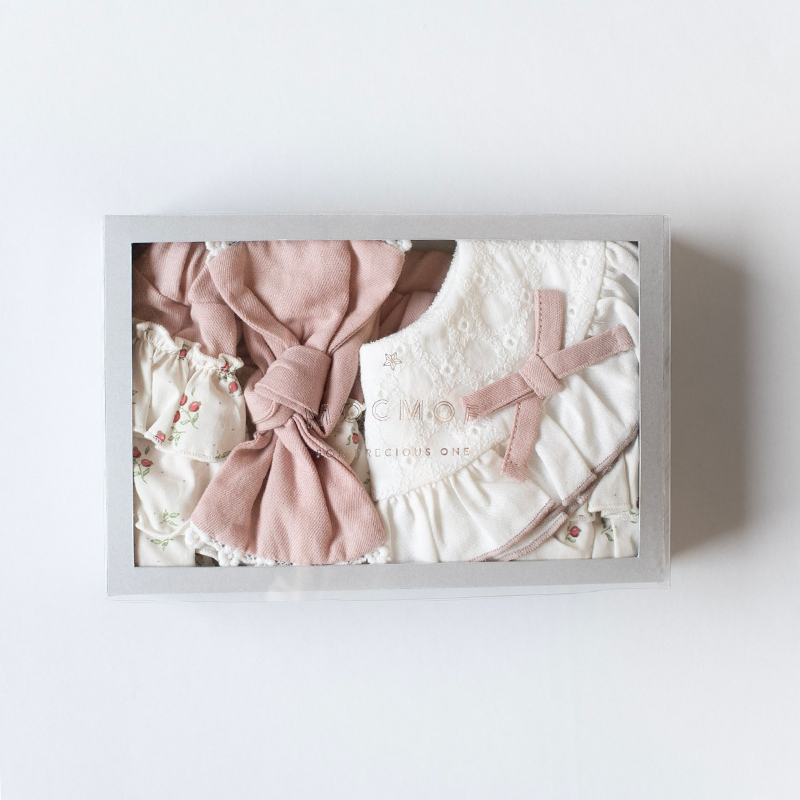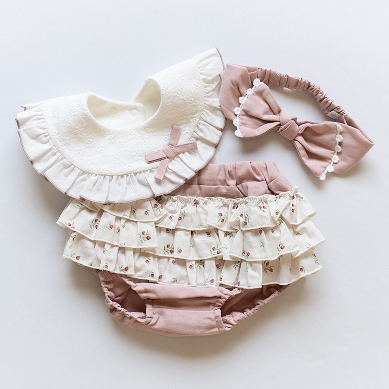 ●素材=スタイ 本体:綿100% 裏布:綿73% ポリエステル27% ブルマ 綿100% ヘアバンド 綿100% ●サイズ(約・cm)= Free 〈ブルマ〉股上23・ウエスト19・ヒップ巾35 〈スタイ〉総丈21.5 総幅:20.5 〈ヘアバンド〉頭囲44-52