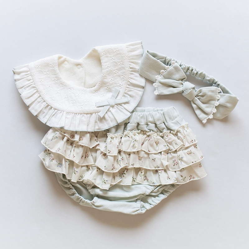 ●素材=スタイ 本体:綿100% 裏布:綿73% ポリエステル27% ブルマ 綿100% ヘアバンド 綿100% ●サイズ(約・cm)= Free 〈ブルマ〉股上23・ウエスト19・ヒップ巾35 〈スタイ〉総丈21.5 総幅:20.5 〈ヘアバンド〉頭囲44-52