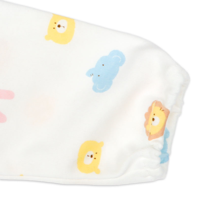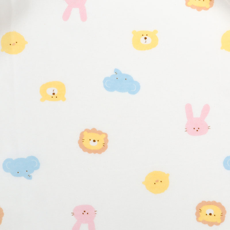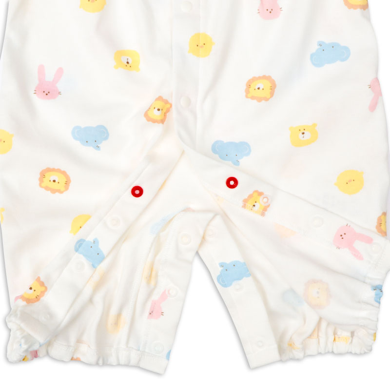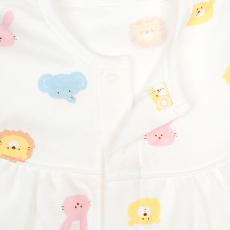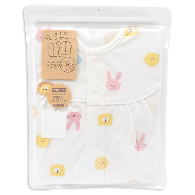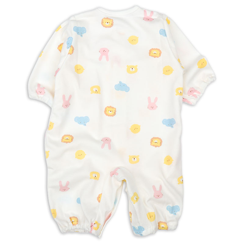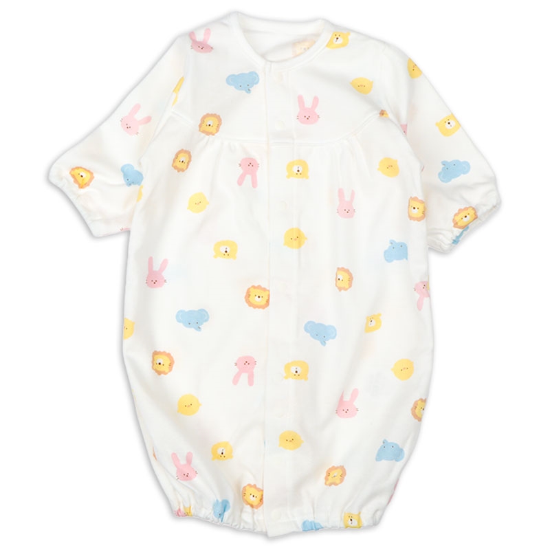 アニマルフェイスプリントがかわいいドレスオールです。1着でドレスオールとしてもカバーオールとしても2通りで使用できる便利商品です。生まれてすぐはおむつ替えで大変。ドレスオールでご使用いただけば裾をまくるだけなのでおむつ替えラクラク。手足をバタバタと活発になってきたらカバーオールタイプにすれば、お洋服もみだれにくくなります。マチ付きなので足まわりがゆったりしています。綿のスムース素材ですので年間を通して着用いただけます。