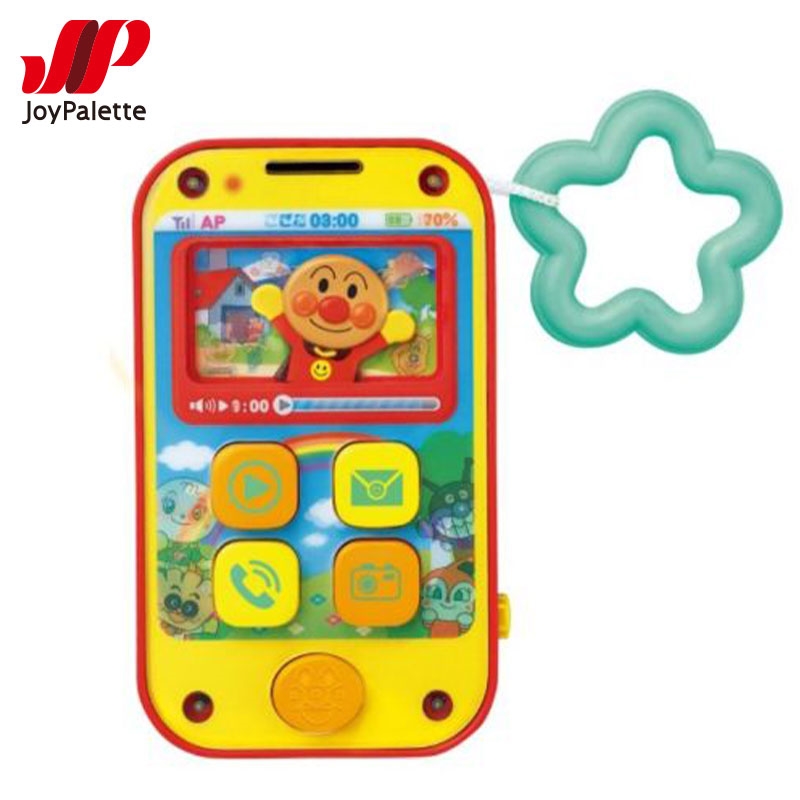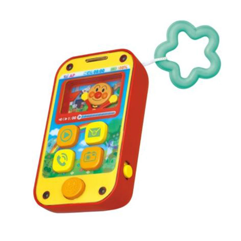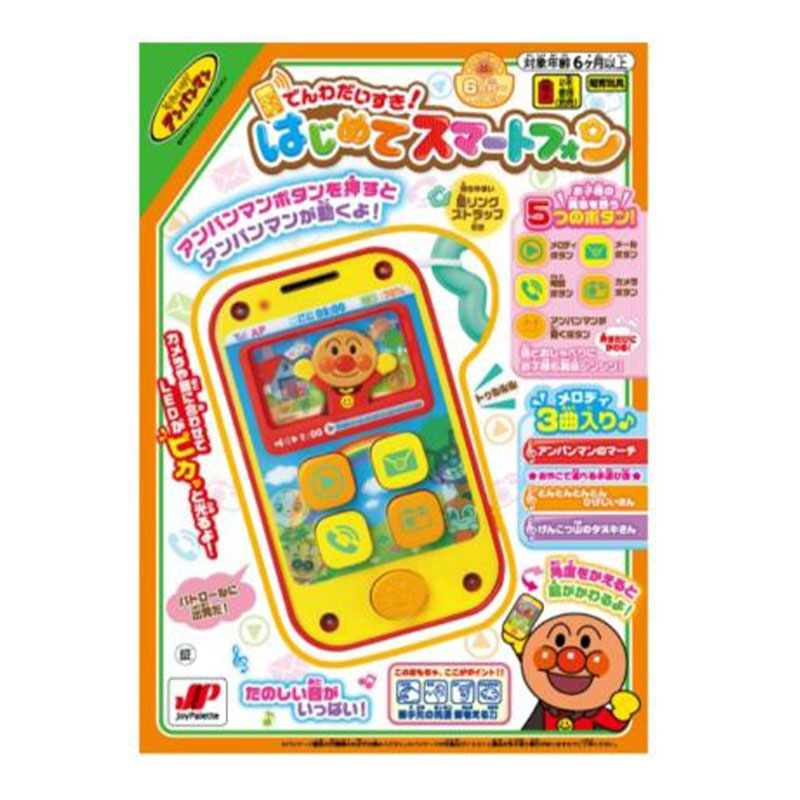 赤ちゃんでも遊べる簡単たのしいスマートフォン。 アンパンマン、メロディ、メール、電話、カメラ、お子様の興味を誘う5つのボタン。 押すたびに音とおしゃべりが変わります。 アンパンマンボタンを押すとアンパンマンが左右に動いて声や効果音が流れます。 メロディは番組曲を含む3曲入り。カメラや音に合わせてLEDがピカッと光ります。 持ちやすい星リングストラップ付き。