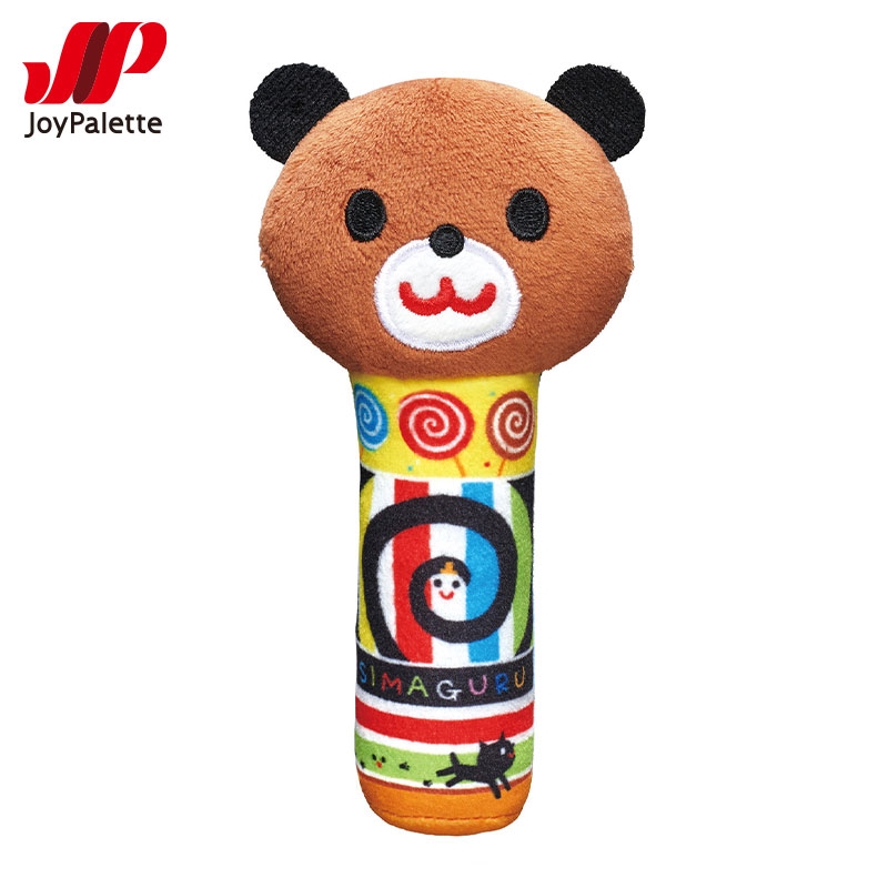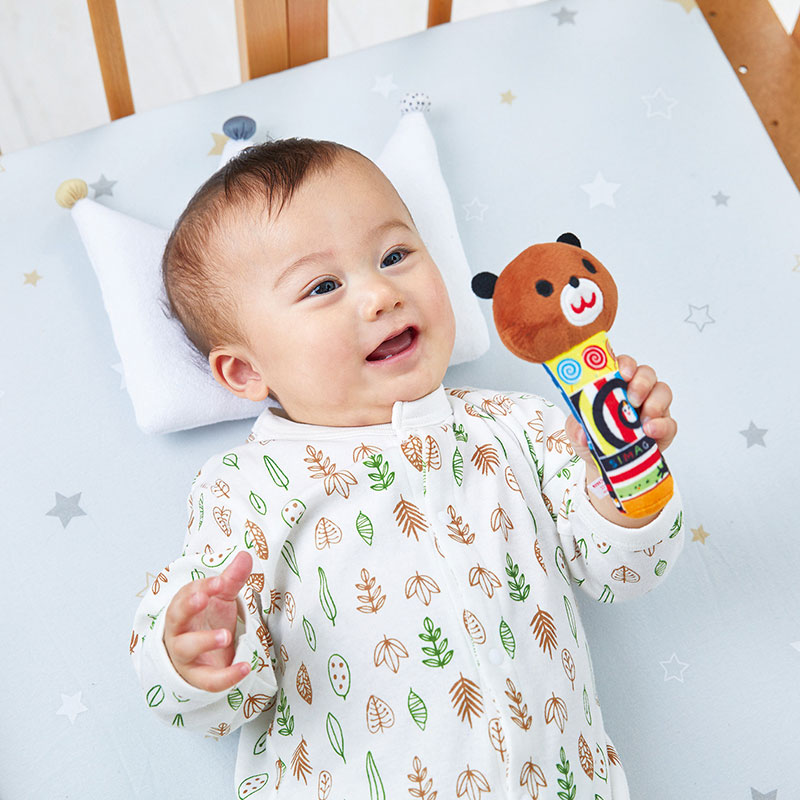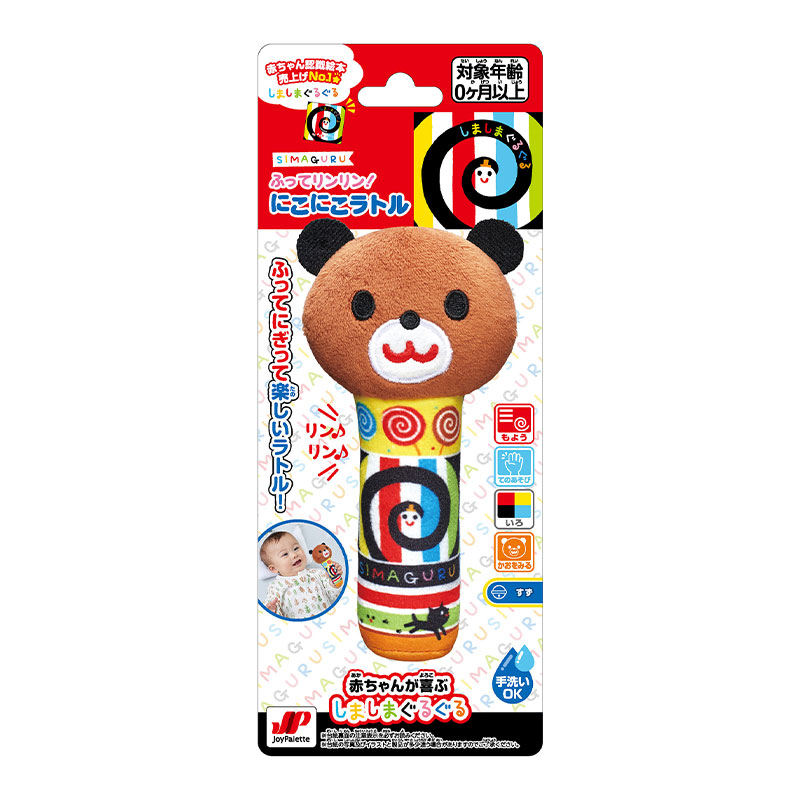 赤ちゃんの手にぴったりサイズのやわらかいラトルです。 ふってリンリンやさしい鈴の音が鳴ります。 赤ちゃんの視覚を刺激するしましまとぐるぐるの絵柄がいっぱいのデザインです。 ラトルを振って音を出したり、ママから赤ちゃんの手に渡したりして、一緒に遊べます。