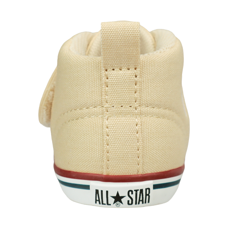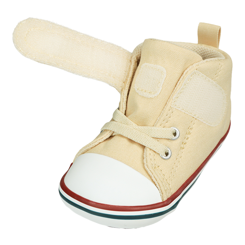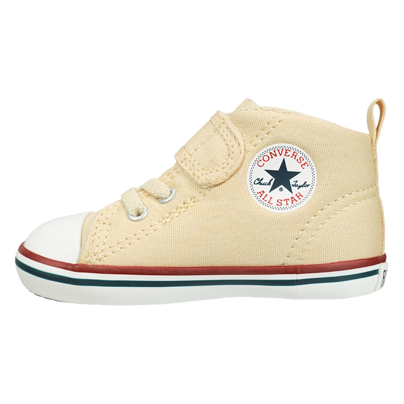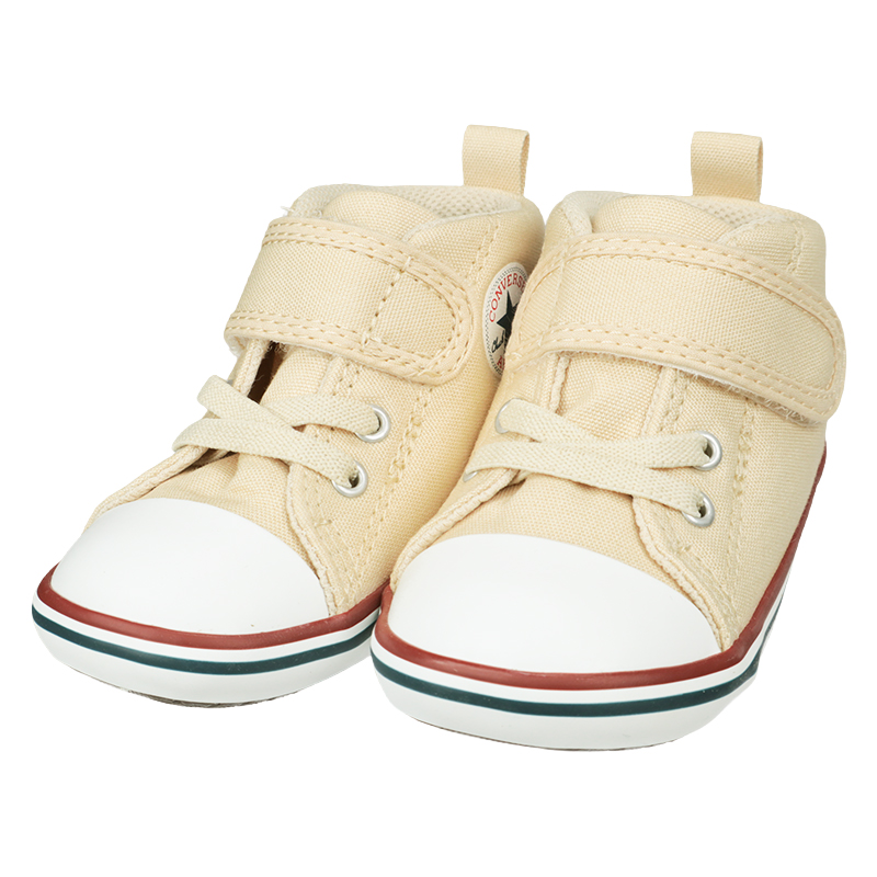 ベビーオールスターのリニューアルモデルです。 大人っぽいデザインに、お子様の足にもやさしい機能を備えてリニューアルしました。 ・ルーミーラスト:ゆったりとしたつま先形状で、指を自由に動かせます。 ・フレックスポイント:足の曲がる位置でしっかり屈曲するソール設計です。 ・オープンタン:タンが大きく開く設計で、靴の脱ぎ履きがスムーズに行えます。 ・フィッティングチェッカー:インソールに足を載せ、爪先にあるガイドラインからはみ出したら買い替えの目安となります。