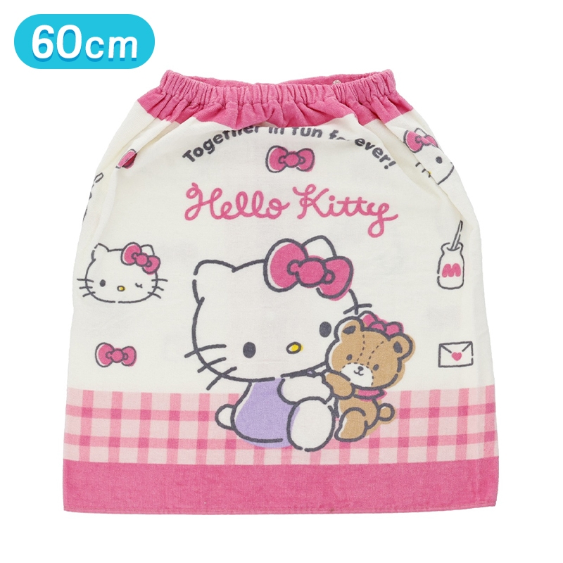 キティとタイニーチャムがデザインされた可愛らしいタオルです。 プールや海、お風呂上りで大活躍の巻きタオルです。 ゴムとスナップボタンが付いているのでスカートやポンチョのようにして使用できます。 お風呂上りや水泳の後などのお着替えにさっと巻けて便利です。