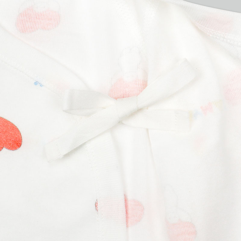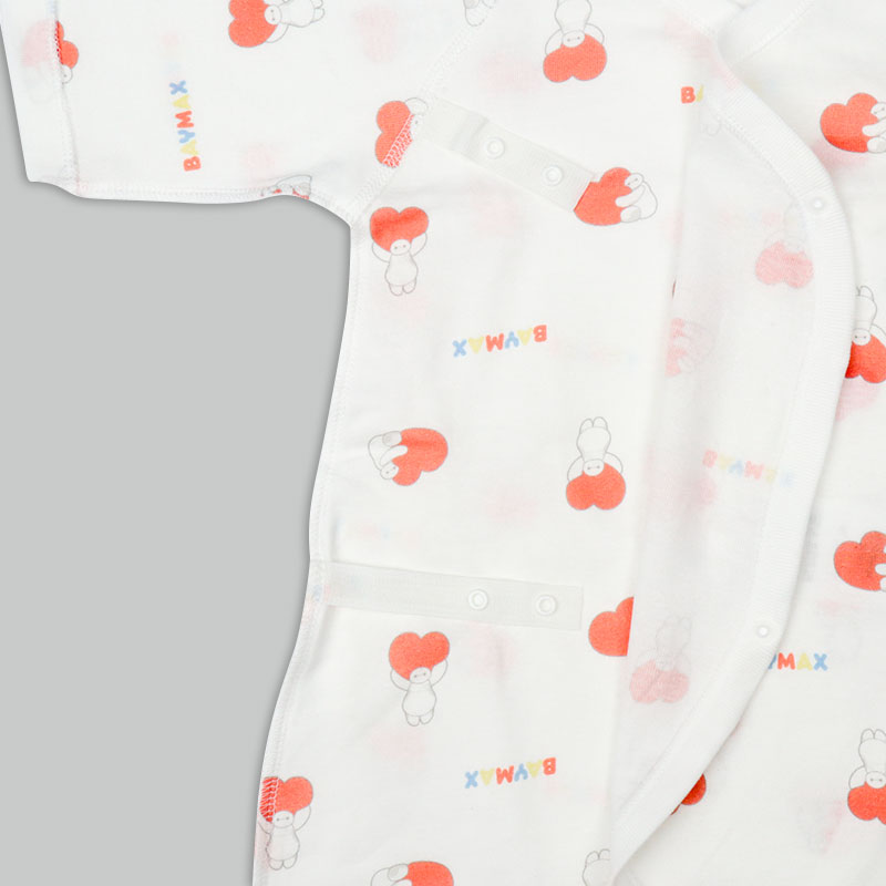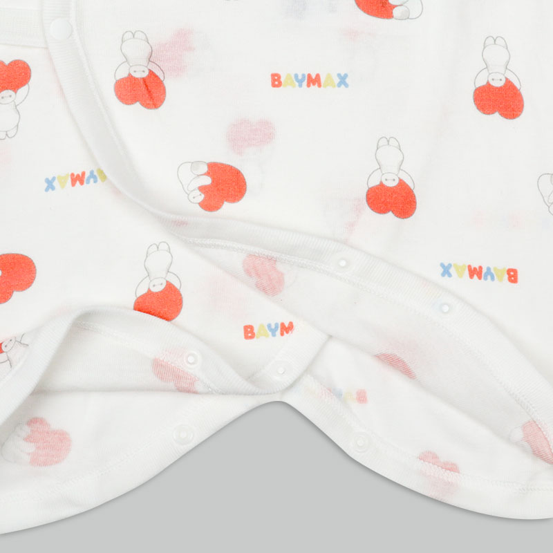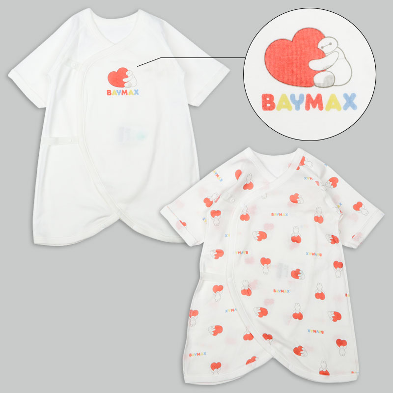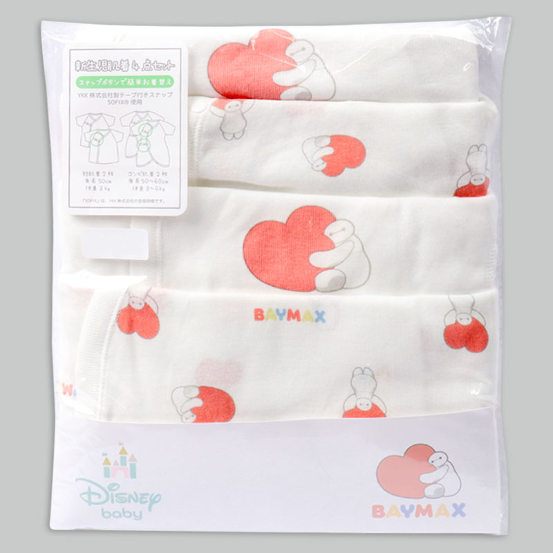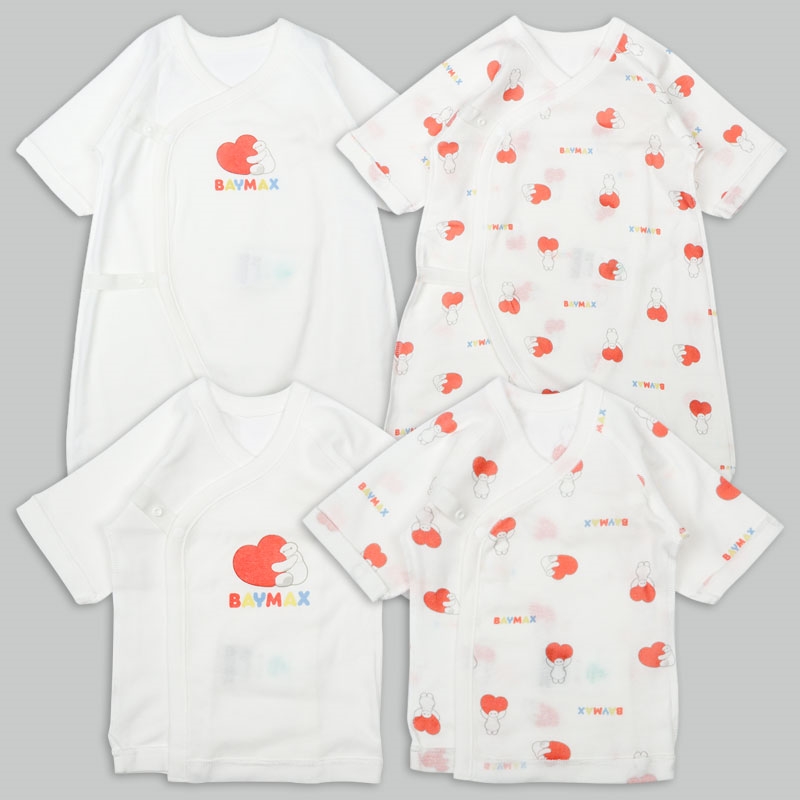 ベイマックスのプリントがかわいい短肌着2点・コンビ肌着2点の新生児肌着4点セット。スナップタイプで簡単時短。 綿100%のフライス素材なので、オールシーズン使用できます。 赤ちゃんの肌に直接あたらないよう、袖口や裾などの折り返し部分の縫い目を外側にしています