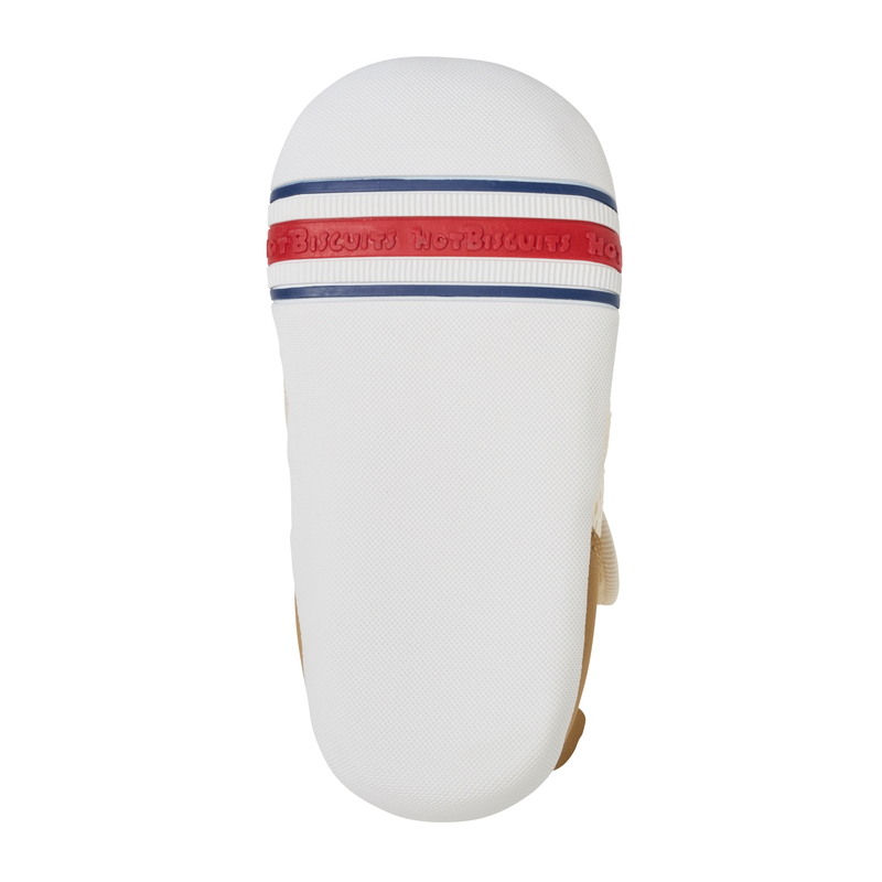 面ファスナーで調節できるので、甲高の赤ちゃんの足にもフィットします。