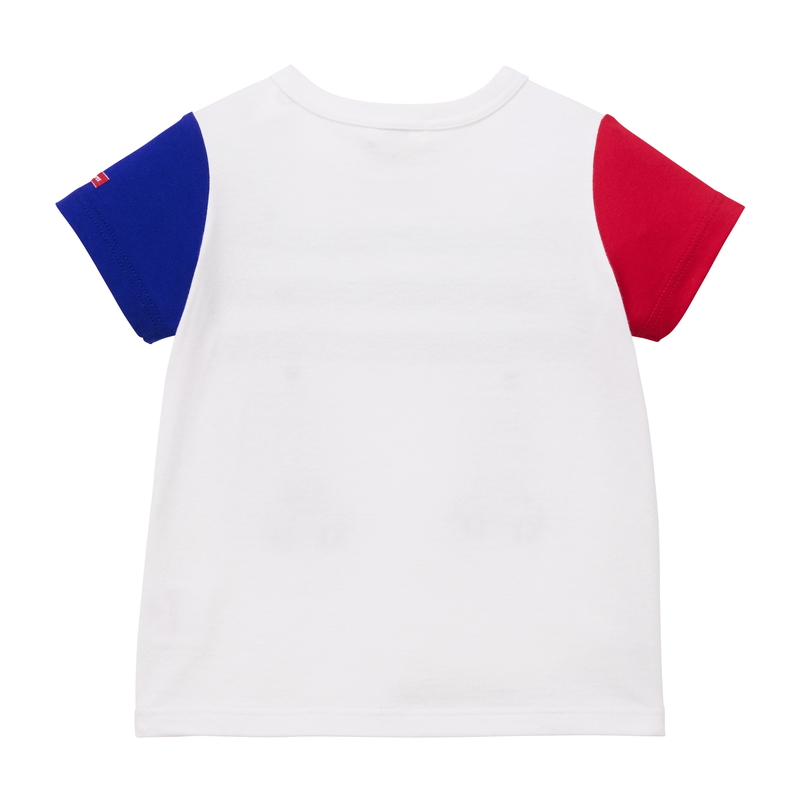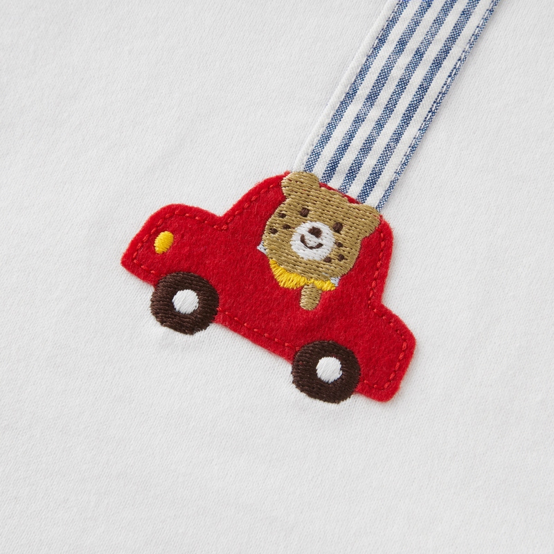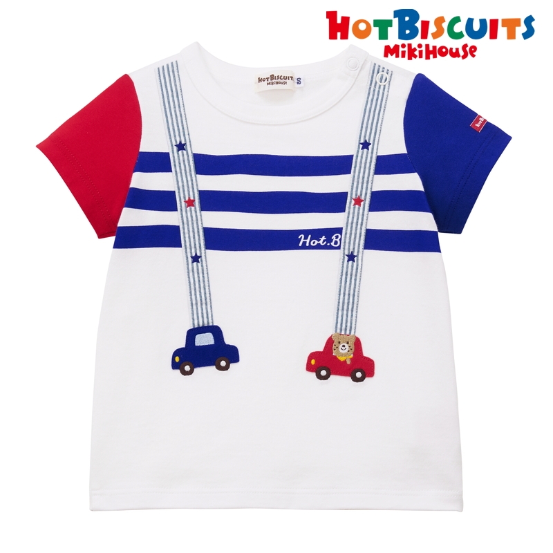 ミキハウス ホットビスケッツのサスペンダーデザインの半袖Tシャツ。 サスペンダーを付けているように見えるデザインに、ビーンズと車モチーフをあしらった遊び心たっぷりの一枚。 ブルーのボーダーとカラフルな袖が爽やかで、夏らしい元気な印象に仕上げました。 胸元のロゴ刺繍もさりげないポイントです。 丈夫なバインダーネックで首元がよれにくく、 お洗濯を繰り返しても型崩れが少ない仕様です。 [素材感] さらっとした肌触りで通気性がよく、汗をしっかりと吸収し 洗濯しても風合いが変わらず型くずれしにくい丈夫な天竺素材。 ……………………………………… 伸縮性:あり 生地:綿100% 袖丈:半袖 おすすめ着用シーズン:春夏 ……………………………………… [スタイリング] 一枚でコーディネートの主役になるデザインなので、 シンプルなパンツと合わせるだけでコーディネートが完成します。 ●生地:日本製 ●~90cmまで肩開き仕様 《HOT BISCUITS ーホットビスケッツー》 ミキハウスホットビスケッツは、”Good Quality”がキーワードのブランド。 子どもたちには毎日ごきげんに、楽しく健やかに 過ごしてほしいから、 お子さまのための良いものづくりを大切にしています。 男の子も女の子も子どもらしく、おしゃれに可愛く着られるアイテムがいっぱい。 赤ちゃんからキッズまでの子ども服・ベビー服・ベビー用品等を幅広くご用意しています。 春夏秋冬の季節に合わせた、ご出産祝いやプレゼント、ギフトもおすすめです。