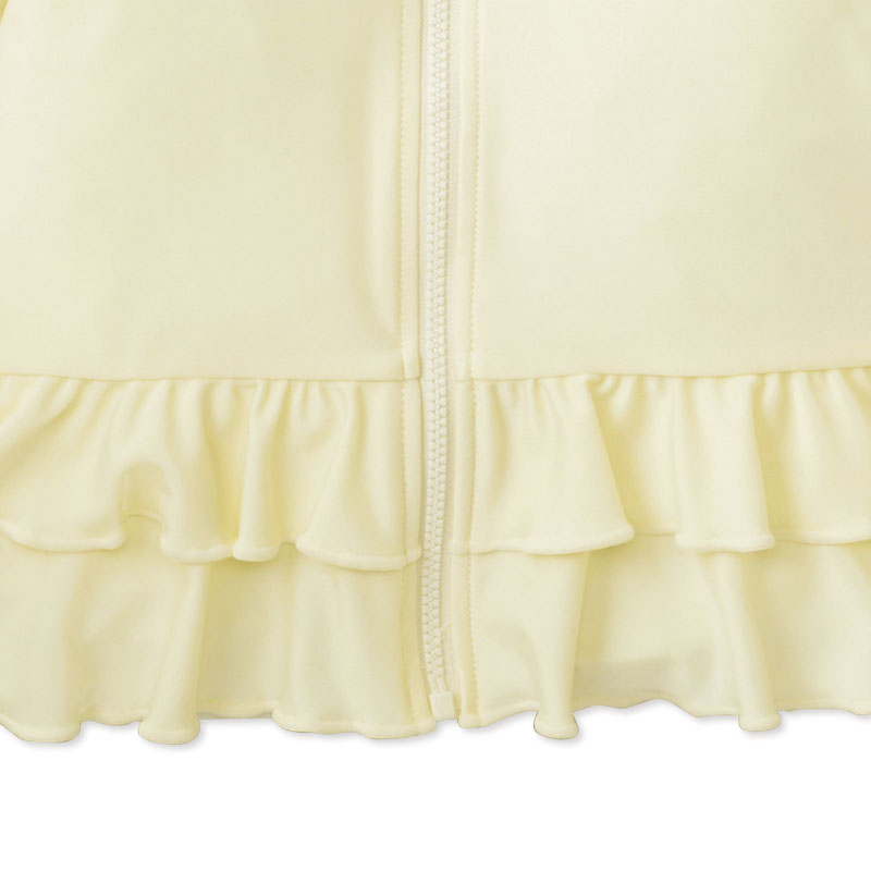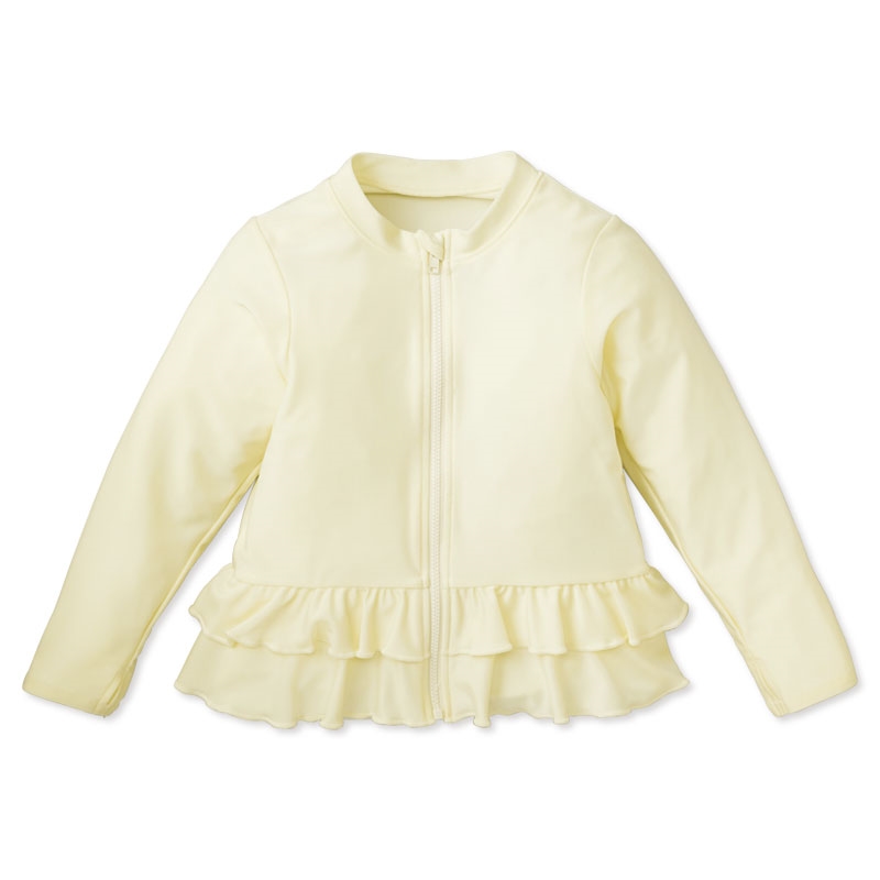 ふんわりフリルがかわいい女の子用ラッシュガード。 フロントジップ仕様で、お着替えもかんたんにできるのがうれしいポイントです。UVカット機能付きで、強い日差しからお子さまのお肌をやさしくガード。首元までしっかりカバーするデザインで、日差しからお肌をやさしく守ります。水あそびはもちろん、プールや海、お外あそびにも大活躍。かわいさと安心感を両立した、水陸両用の毎日使いたくなる一枚です。