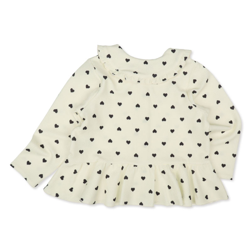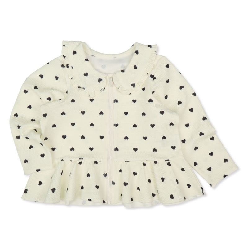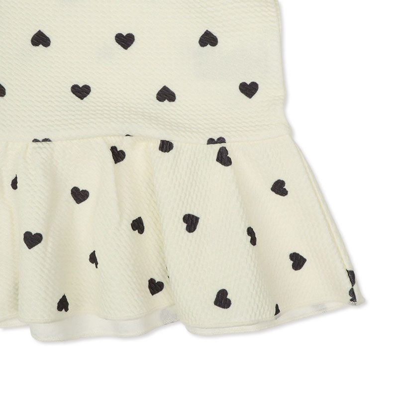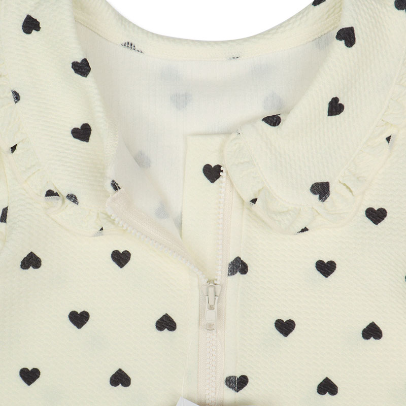 さりげないハート柄がかわいい長袖ラッシュガード。 首元は丸襟&フリルデザインで、上品で女の子らしい印象に仕上げました。前開きファスナー仕様で、お着替えもスムーズ。ウエストの切り替えフリルが動きやすさと可愛さを両立します。紫外線対策としてはもちろん、水遊びや公園遊びなどデイリーにも活躍できる水陸両用アイテム。やわらかな着心地で、お子さまも快適に過ごせます。