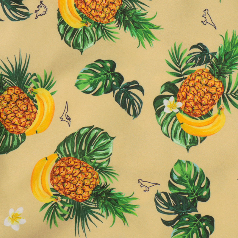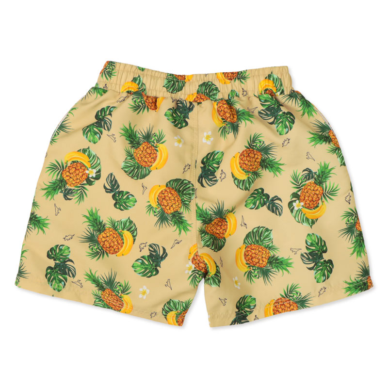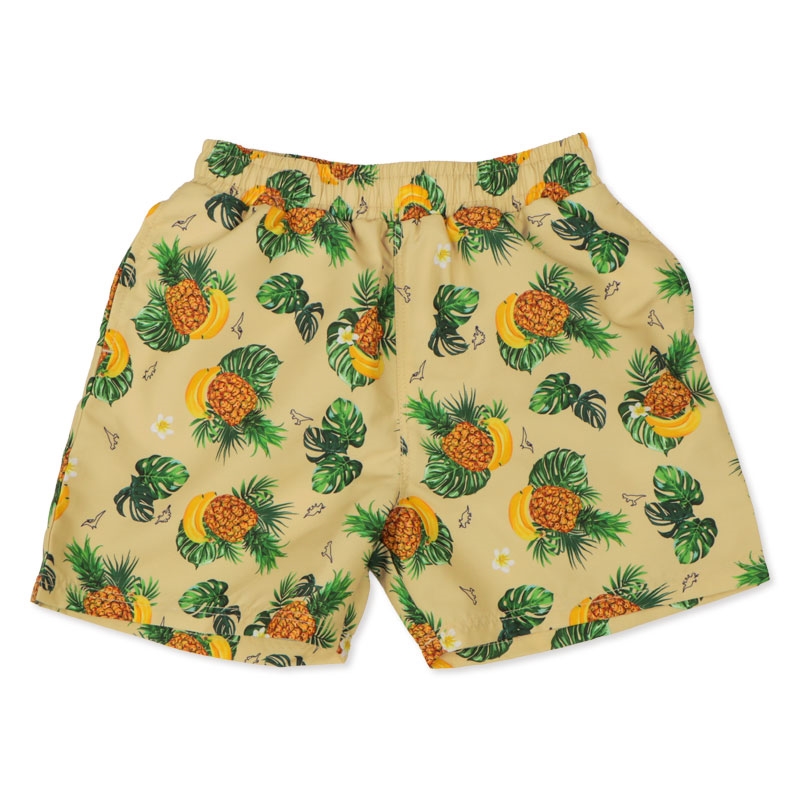 パイナップルとリーフ柄が夏らしい、トロピカルデザインのサーフパンツ。明るく元気なカラーリングで、海やプールで映える一枚です。ウエストは総ゴム仕様で、動きやすくお子さまでも着脱簡単。ゆったりとしたシルエットで、水遊びやアウトドアでも快適に過ごせます。軽くて乾きやすい素材なので、お手入れもラクラク。夏のおでかけやリゾートシーンにぴったりのアイテムです。