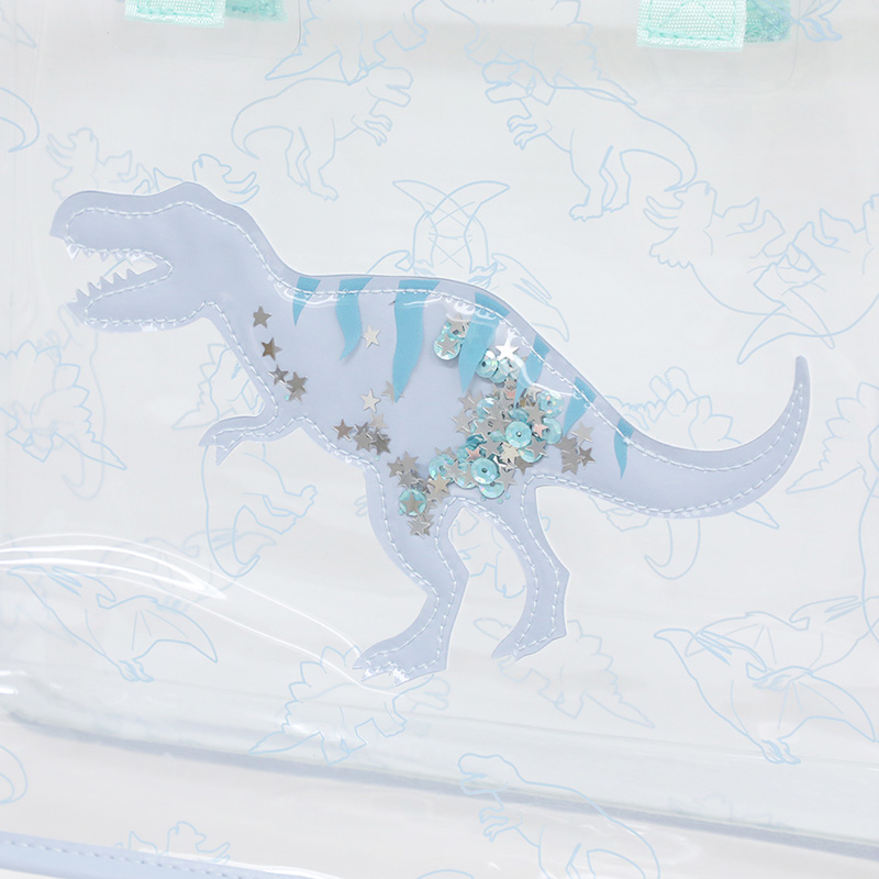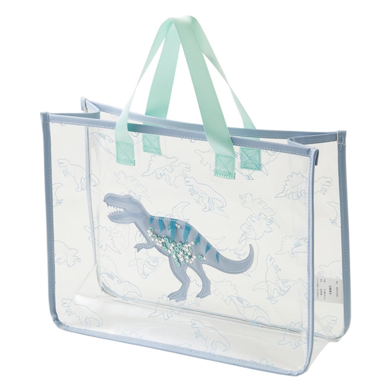 フロントの恐竜とスパンコールが目を惹く、ビーチバッグ。 マチがしっかりあるので、スイムグッズやお着替えセットを収納可能です。