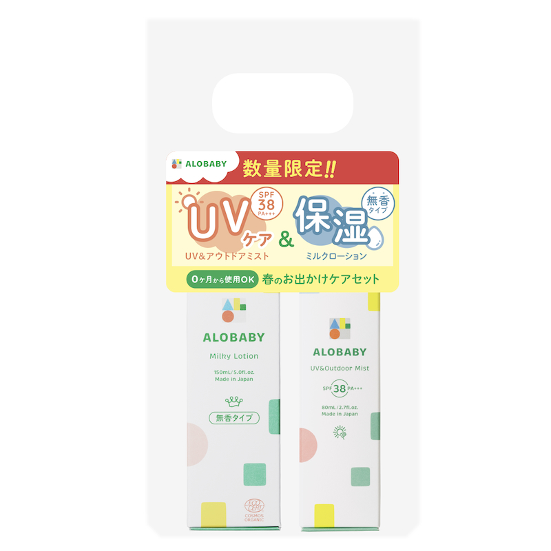 UVケア&保湿の春のお出かけケアセット 【ミルクローション無香】高保湿成分ホホバオイルやシアバターを配合したベビーローション。 顔・全身の保湿ケアに。無香タイプ。 【UV&アウトドアミスト】紫外線とアウトドア対策の1本2役。 お出かけ前や動き回る赤ちゃんにこれ一本で手軽にUV&虫よけ対策ができます。 ●ミルクローション無香 【 ベタつかず塗りやすい 】やわらかく伸ばしやすいテクスチャーで、角質層内部まですーっと浸透。 ベタつかずに馴染むので、活動期の赤ちゃんや子供にも使いやすいミルクタイプのローションです。 厳選を重ねたラベンダー&ローズマリーから抽出された天然オーガニックオイルを使用。 【 こんな方におすすめ 】乾燥や肌荒れが気になるが薬以外でケアしてあげたい。 赤ちゃんのスキンケアは無添加で安心できるものを使いたい。 別の保湿剤を使っているが保湿力が物足りない。ベタつくのが苦手で塗りやすいものがいい。 【 こんな方におすすめ 】乾燥や肌荒れが気になるが薬以外でケアしてあげたい。赤ちゃんのスキンケアは無添加で安心できるものを使いたい。 別の保湿剤を使っているが保湿力が物足りない。 ベタつくのが苦手で塗りやすいものがいい。 ●UVアウトドアミスト 1. 手軽に使える商品設計 ■1本2役 アロベビー UV&アウトドアミストは紫外線とアウトドア対策の1本2役。 忙しいお出かけ前や、動き回る赤ちゃんやキッズにもこれ一本で手軽にUV&虫よけ対策ができ、ママへも赤ちゃんへも使い心地にこだわっています。 ■ミストタイプで簡単に塗布できる アロベビー UV&アウトドアミストはミストタイプなので、一吹きでサッと手軽に紫外線や虫から赤ちゃんをしっかり守ってあげられます。 塗り直しも簡単。 2. 敏感な赤ちゃんの肌にやさしい処方 ■100%天然由来 100%天然由来成分なので、新生児の赤ちゃんのお顔から全身までご使用いただけます。 もちろん敏感肌の大人の方もご使用いただけます。 ■合成紫外線吸収剤不使用 アロベビー UV&アウトドアミストは合成紫外線吸収剤不使用。 紫外線散乱剤の酸化チタンをナノ化しシリカでコーティングしているため赤ちゃんの肌への負担を軽減し、安心してご使用いただけます。 ■ディート不使用 アロベビー UV&アウトドアミストはレモングラスやローズマリーなどの虫の嫌いな天然アロマの香りで外敵から赤ちゃんを守ります。 ■SPF38/PA++ 日常のおでかけでも十分なUVケアができます。 ■お湯で洗い流せる アロベビー UV&アウトドアミストはお湯で落とせるから、お風呂でも赤ちゃんの肌を擦る必要がなく、肌への刺激を最小限に軽減します。 ■純国産オーガニック 「原料」「使い心地」「安心」に徹底し、50年以上スキンケアなどの製造実績をもつメーカーの協力により、開発から生産まですべてがMade in Japan。 国産オーガニックだから安心してご使用いただけます。 3.使い心地の良さ ■白浮きしにくい アロベビーUV&アウトドアミストは酸化チタン粒子を細かくミスト状にすることで白浮きを抑えています。 ■優しいアロマの香り 日焼け止めやスプレー独特の嫌な匂いはなく、レモングラスやローズマリー葉油などの天然のアロマを使用。 優しい香りなので香りに敏感な赤ちゃんも嫌がらず、ママも赤ちゃんも心地よくご使用いただけます。
