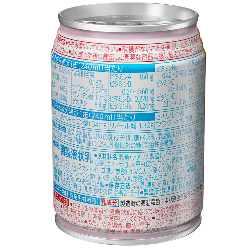 ●種類別:調製液状乳 ●対象月齢:1-3歳頃まで ●内容量:240ml×24本 ●原材料:乳糖(アメリカ製造)、バターミルクパウダー、調整食用油脂(カノーラ油、大豆白絞油、ヤシ油、精製魚油)、ホエイパウダー、脱脂粉乳、デキストリン、フラクトオリゴ糖/炭酸Ca、V.C、リン酸K、炭酸K、クエン酸鉄Na、クエン酸Na、V.E、ナイアシン、パントテン酸Ca、V.B1、V.B6、V.A、葉酸、V.B2、ビオチン、V.D、V.B12
