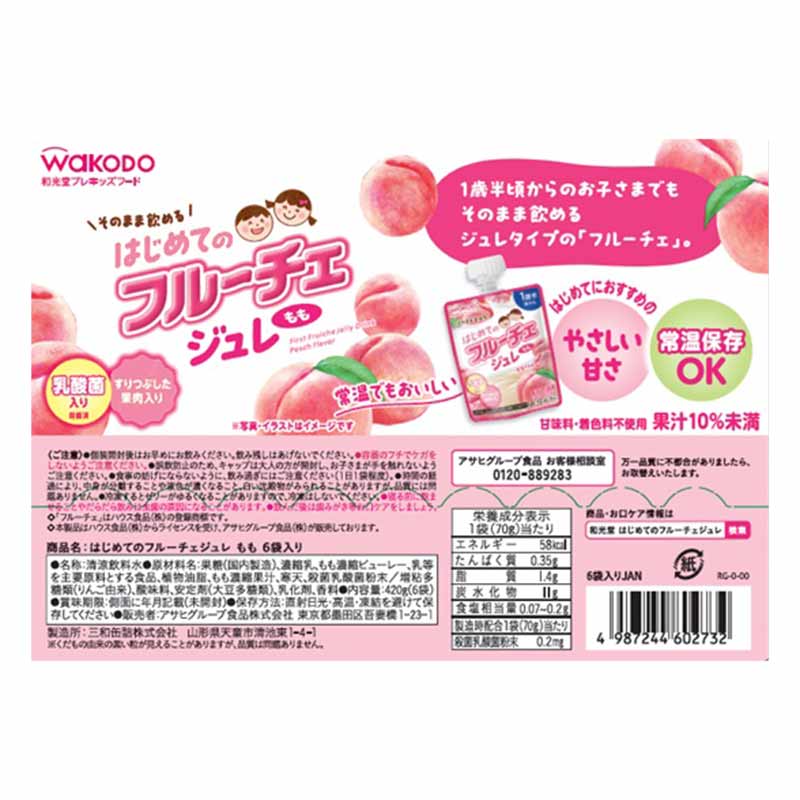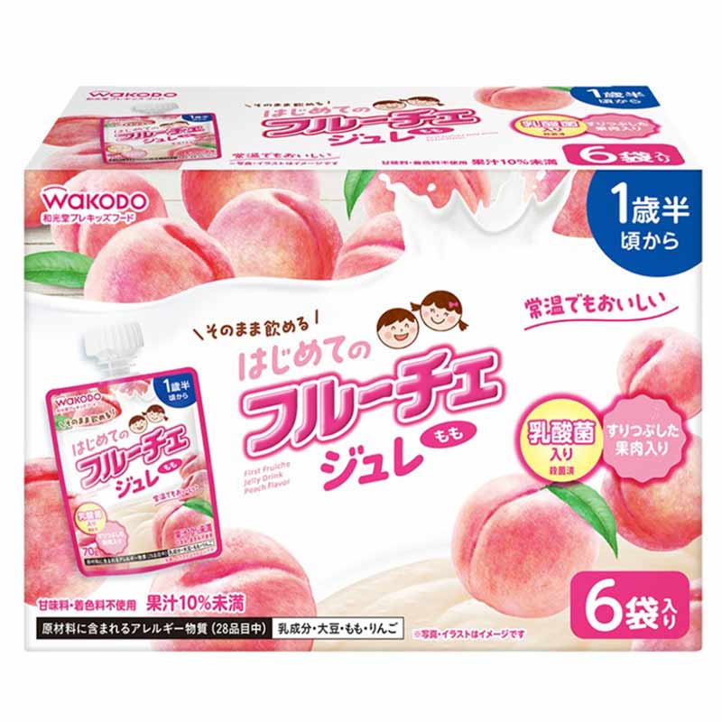 ●内容量:70g×6袋 ●原材料:果糖(国内製造)、濃縮乳、もも濃縮ピューレー、乳等を主要原料とする食品、植物油脂、もも濃縮果汁、寒天、殺菌乳酸菌粉末/増粘多糖類(りんご由来)、酸味料、安定剤(大豆多糖類)、乳化剤、香料【栄養成分表示】エネルギー:58kcal、たんぱく質:0.35g、脂質:1.4g、炭水化物:11g、食塩相当量:0.07~0.2g<枠外><製造時配合>殺菌乳酸菌粉末:0.2mg