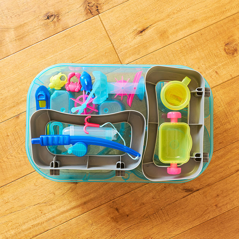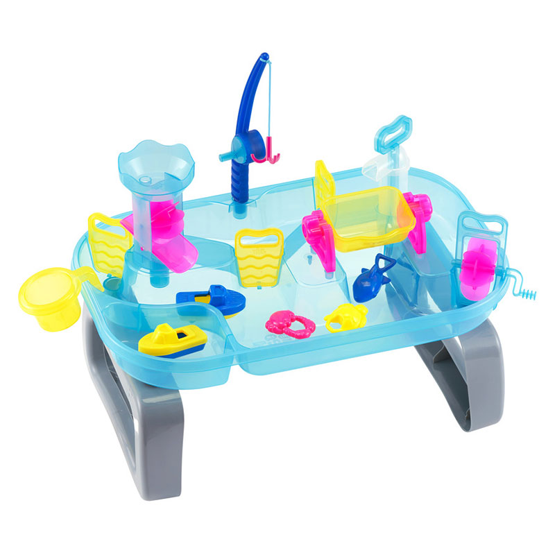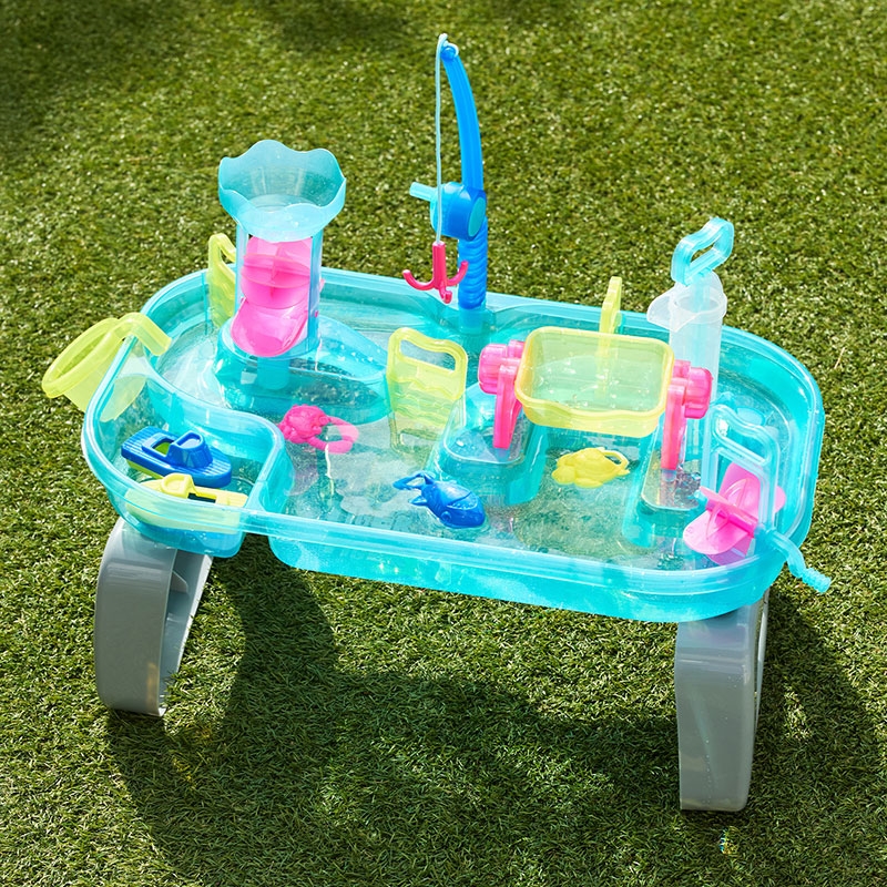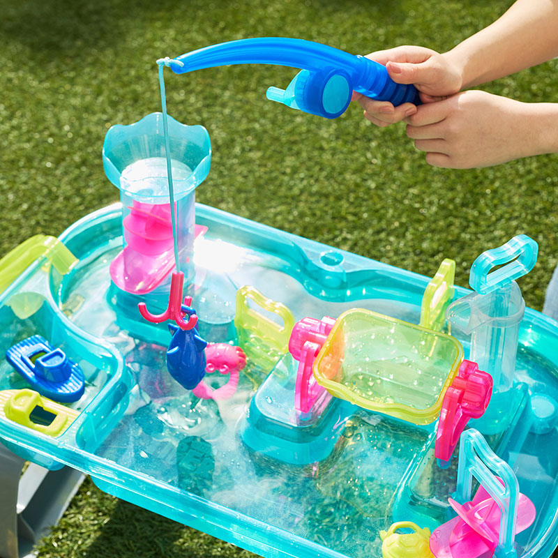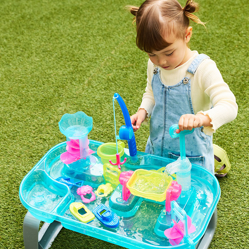 遊びながら楽しく学べる水遊びおもちゃ。 豊富なしかけで水の性質や変化に親しめたり、 指先を使った細かな動作が知育につながります。工具不要で組み立て簡単。 お庭やバルコニーでも遊べるコンパクトサイズで、使わないときは脚を外して収納できます。 クリアなネオンカラーが設置場所を明るくし、見た目も涼しいです。 ポンプで水をくみ上げたり、水のちからで水車タワーを回転させたり、 ストッパーで水の流れを変えて、手回し水車で船を動かしたり、釣り竿でお魚つりも。 これ1台でたくさんの遊びが楽しめます。