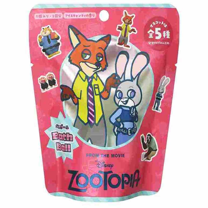 ズートピア2の映画公開に合わせて、バスボールが新登場! パッと目を惹くピンク色の可愛いパッケージデザインです。 発泡タイプのマスコット入り入浴剤。 バスボールが溶けるとズートピアの仲間たちマスコットが出てくる。 マスコットは全5種。 (c)Disney