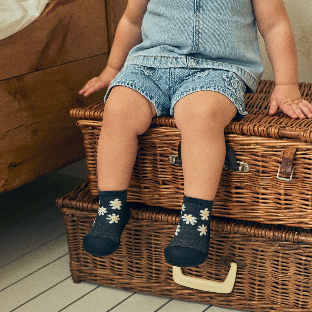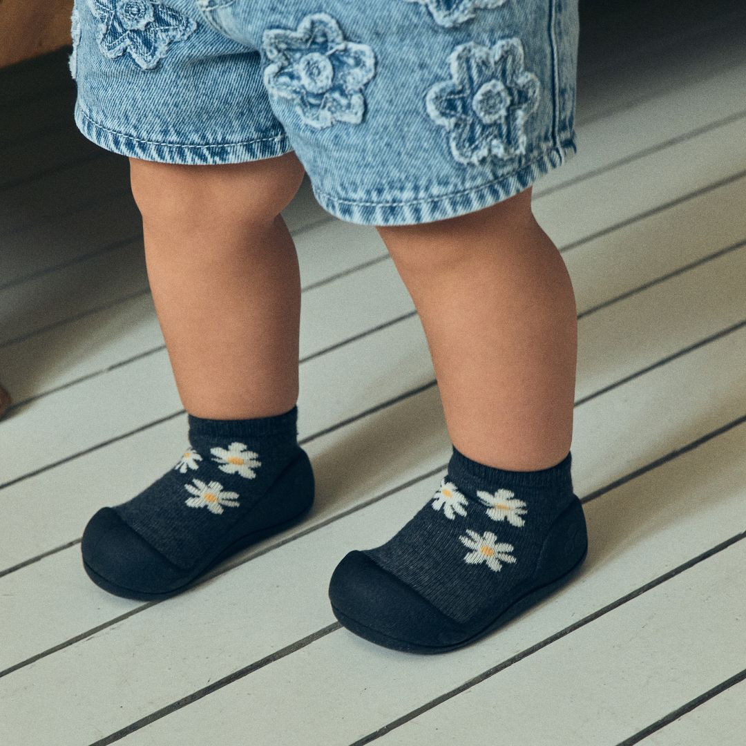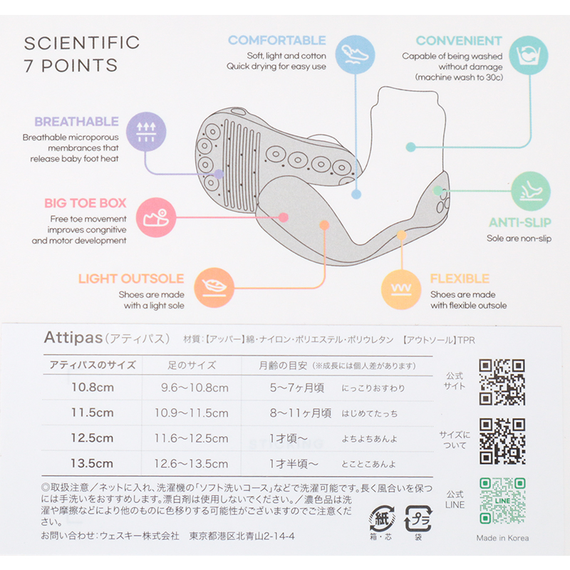 年齢別サイズの目安M:11.5cm 足のサイズ:109~115mm 目安年齢:8~11ヶ月 L:12.5cm 足のサイズ:116~125mm 目安年齢:12ヶ月~ XL:13.5cm 足のサイズ:126~135mm 目安年齢:18ヶ月~ アッパー:綿・ナイロン・ポリエステル・ポリウレタン アウトソール:サーモプラスチックラバー