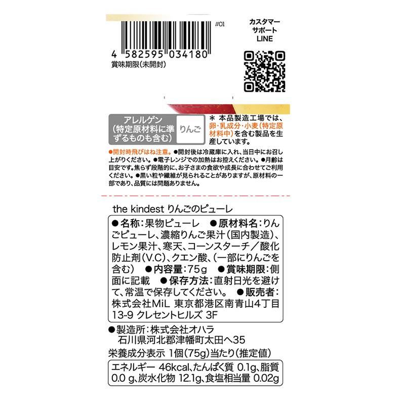 ●りんごのピューレ ●原材料名:りんごピューレ、濃縮りんご果汁(国内製造)、レモン果汁、寒天、コーンスターチ/酸化防止剤(V.C)、クエン酸、(一部にりんごを含む) ●内容量:75g ●栄養成分:1個当たり 熱量 46kcal たんぱく質 0.1g 脂質 0.0g 炭水化物 12.1g 食塩相当量 0.02g
