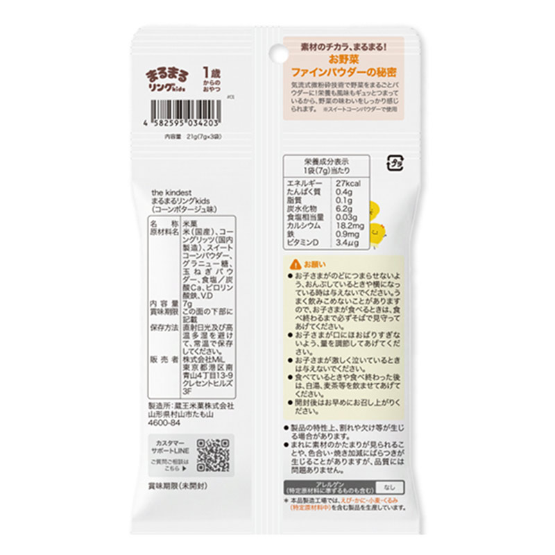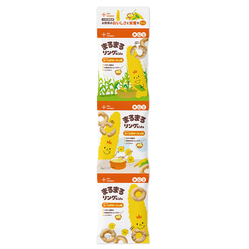 ●米菓 ●原材料名:米(国産)、コーングリッツ(国内製造)、スイートコーンパウダー、グラニュー糖、玉ねぎパウダー、食塩/炭酸Ca、ピロリン酸鉄、V.D ●内容量:21g ●栄養成分:1袋当たり 熱量 27kcal たんぱく質 0.4g 脂質 0.1g 炭水化物 6.2g 食塩相当量 0.03g カルシウム 18.2mg 鉄 0.9mg ビタミンD 3.4μg