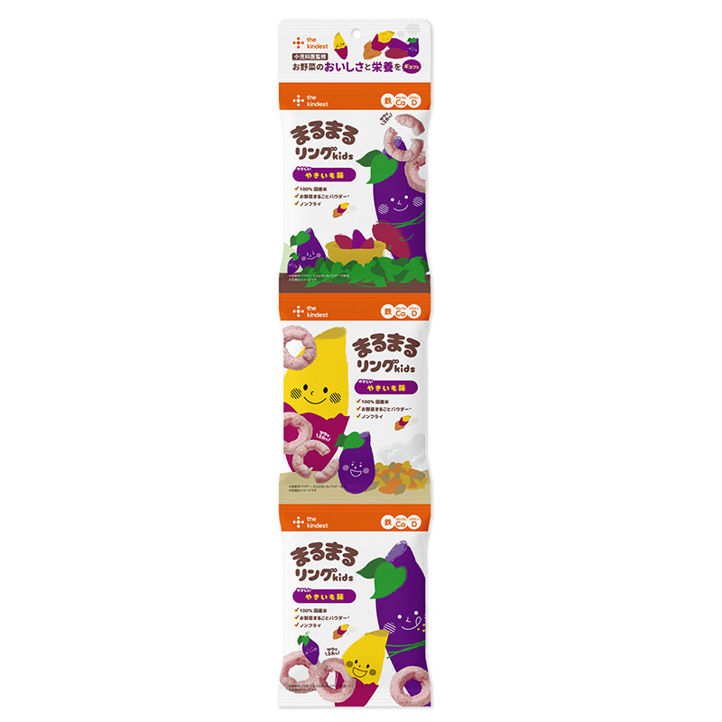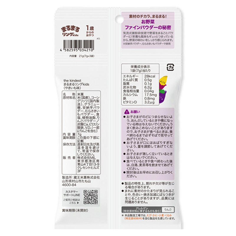 ●米菓 ●原材料名:米(国産)、コーングリッツ(国内製造)、グラニュー糖、安納芋パウダー、むらさきいもパウダー、食塩、植物油脂、りんごパウダー/炭酸Ca、ピロリン酸鉄、V.D、(一部にりんごを含む) ●内容量:21g(7g×3袋) ●栄養成分:1袋当たり 熱量 28kcal たんぱく質 0.5g 脂質 0.1g 炭水化物 6.2g 食塩相当量 0.04g カルシウム 17.5mg 鉄 0.8mg ビタミンD 3.2μg
