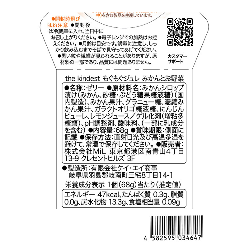 ●もぐもぐジュレ みかんとお野菜 ●原材料名:みかんシロップ漬け(みかん、砂糖・ぶどう糖果糖液糖)(国内製造)、みかん果汁、グラニュー糖、濃縮みかん果汁、ガラクトオリゴ糖液糖、にんじんピューレ、レモンジュース/ゲル化剤(増粘多糖類)、pH調整剤、酸味料、(一部に乳成分を含む) ●内容量:68g ●栄養成分:1個当たり 熱量 47kcal たんぱく質 0.3g 脂質 0.0g 炭水化物 13.3g 食塩相当量 0.09g