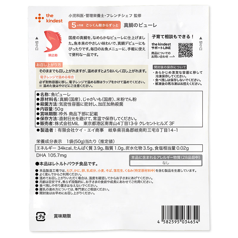 ●真鯛のピューレ ●原材料名:真鯛(国産)、じゃがいも(国産)、米粉でん粉 ●内容量:50g ●栄養成分:1袋当たり 熱量 34kcal たんぱく質 3.9g 脂質 1.0g 炭水化物 3.5g 食塩相当量 0.02g