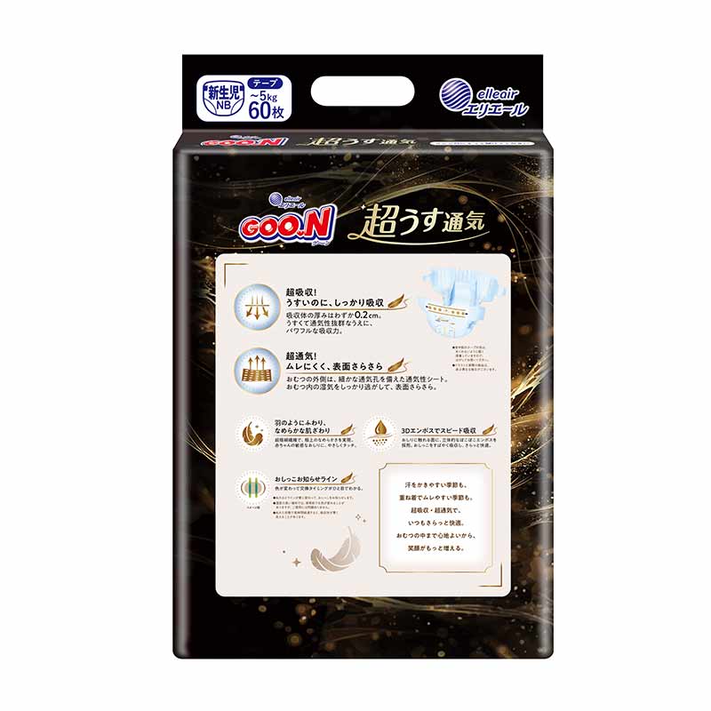 超吸収!うすいのに、しっかり吸収。 超通気、ムレにくく、表面さらさら。 おしりに触れる面に、立体的なぽこぽこエンボスを使用。 おしっこをすばやく吸収し、さらっと快適。
