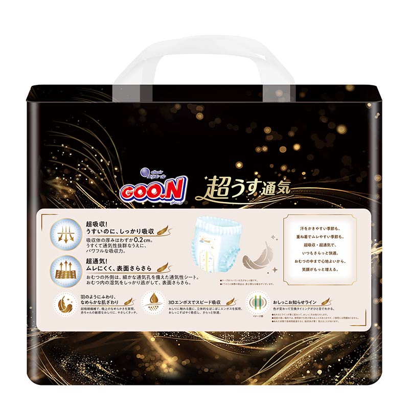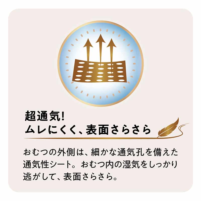 超吸収!うすいのに、しっかり吸収。 超通気、ムレにくく、表面さらさら。 おしりに触れる面に、立体的なぽこぽこエンボスを使用。 おしっこをすばやく吸収し、さらっと快適。