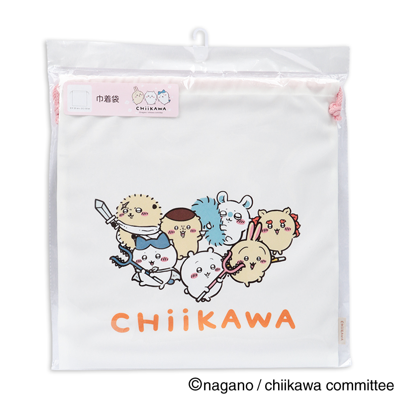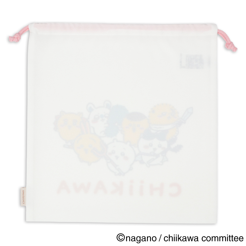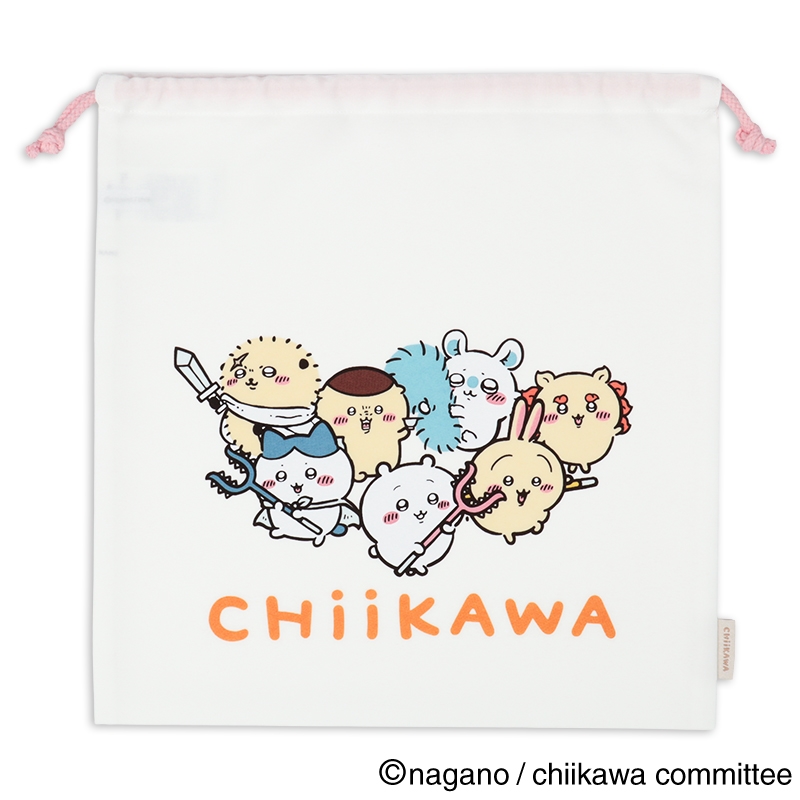 ちいかわたちが大集合した、にぎやかなデザインの大サイズ巾着です。 お着替えや体操服、タオルなどめしっかり入るサイズ感で、通園・通学や習い事にぴったりです。 小サイズとセットで使えば、用途に合わせた使い分けもできてとっても便利です。