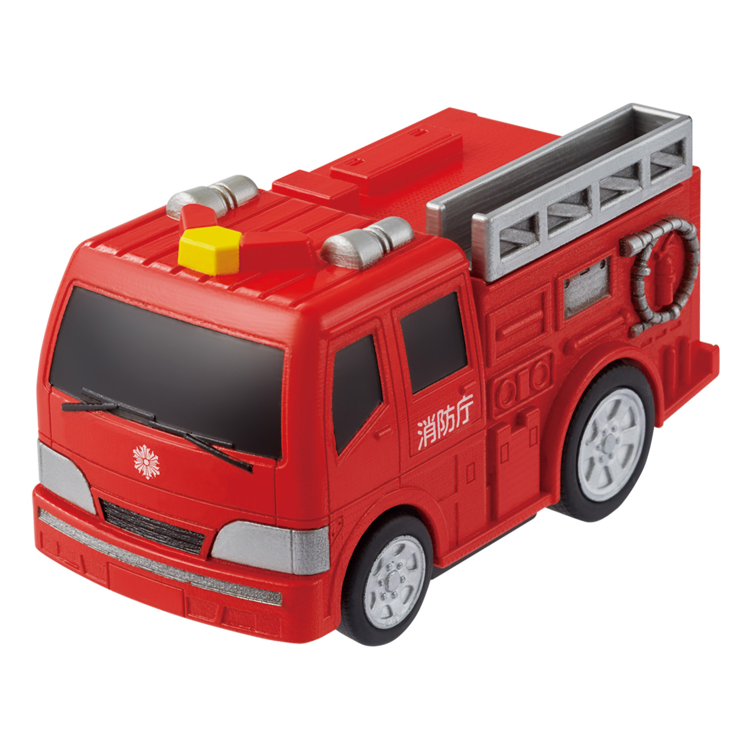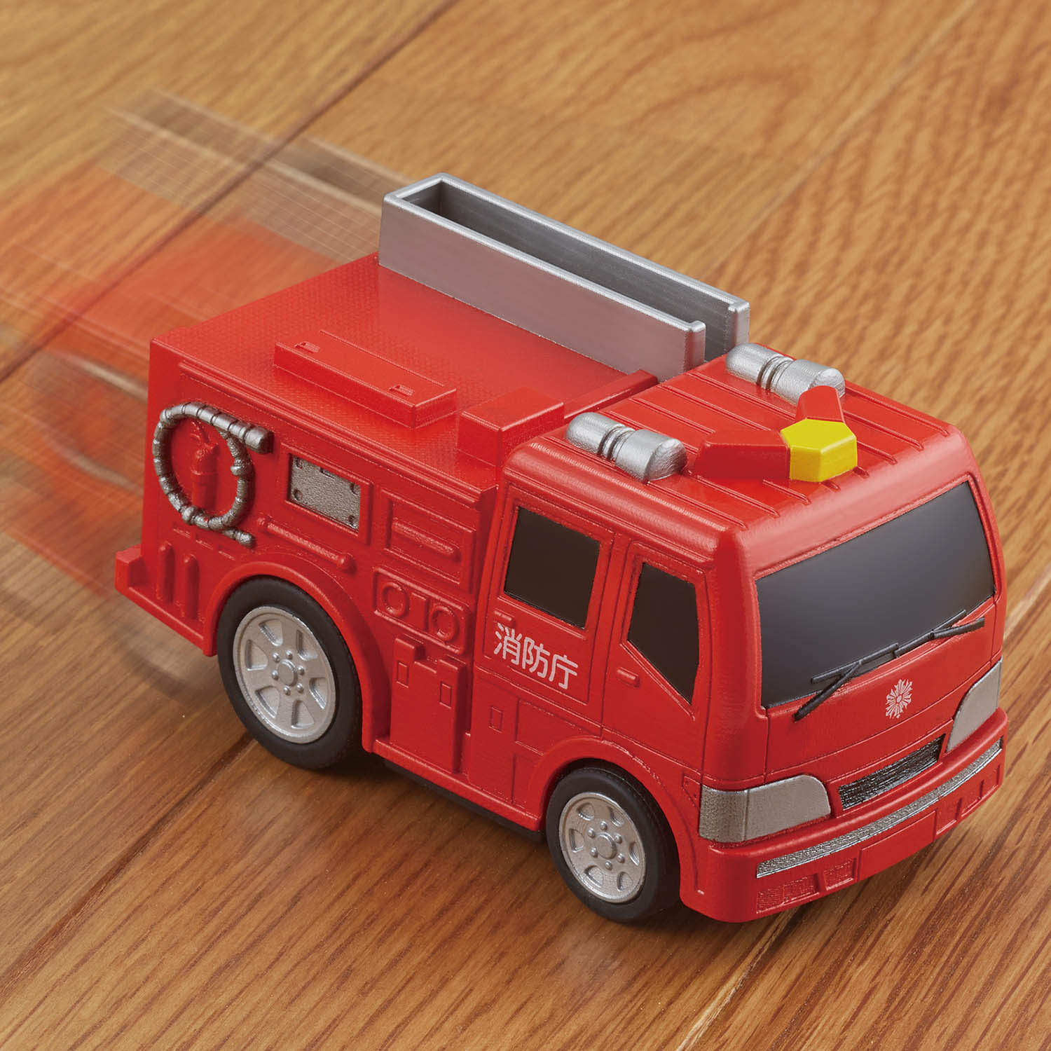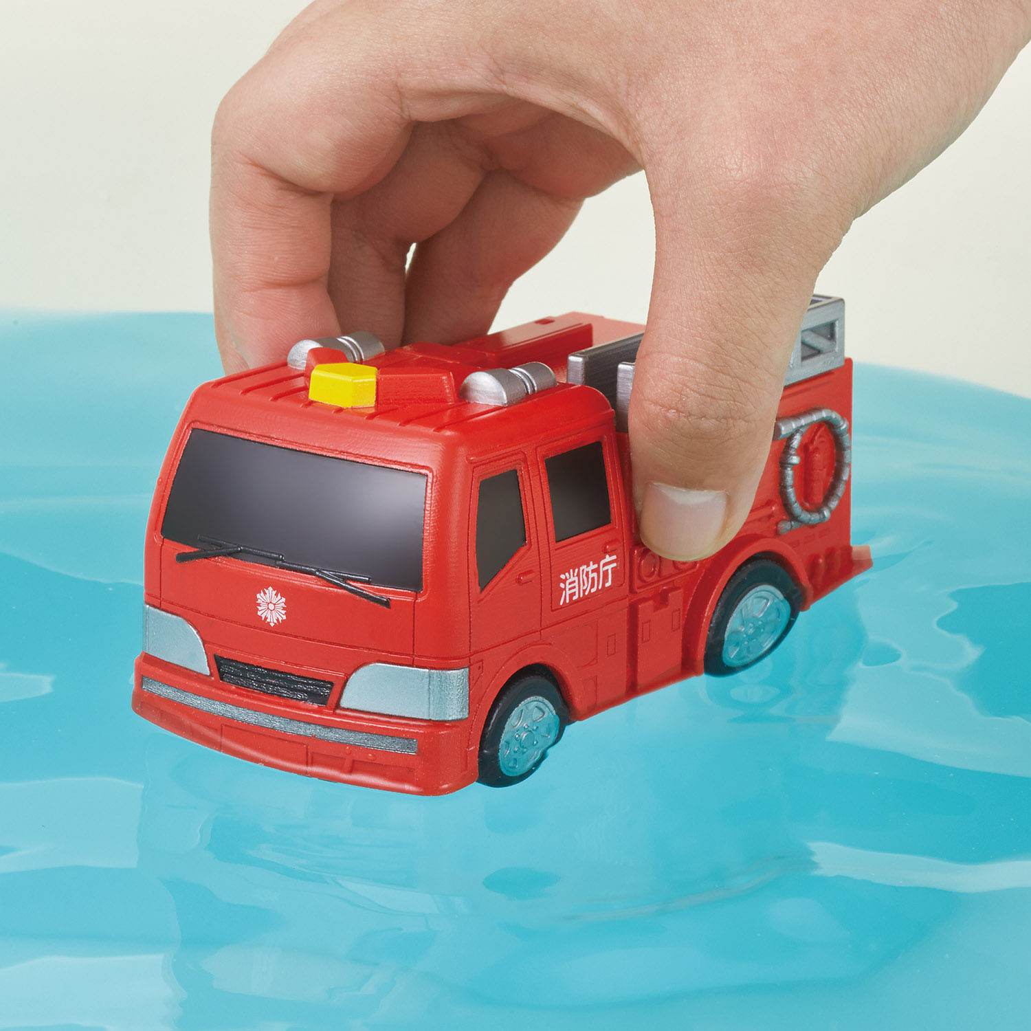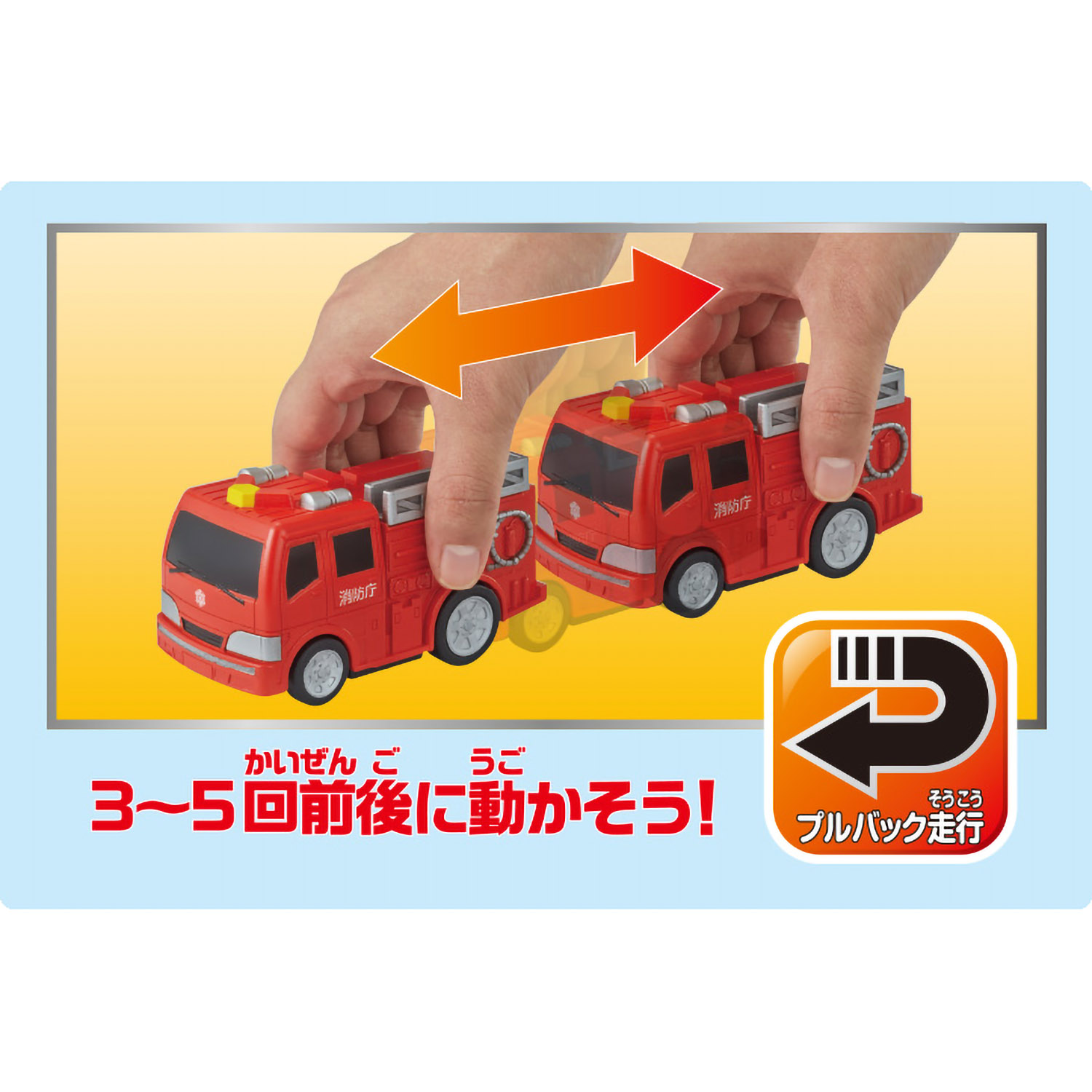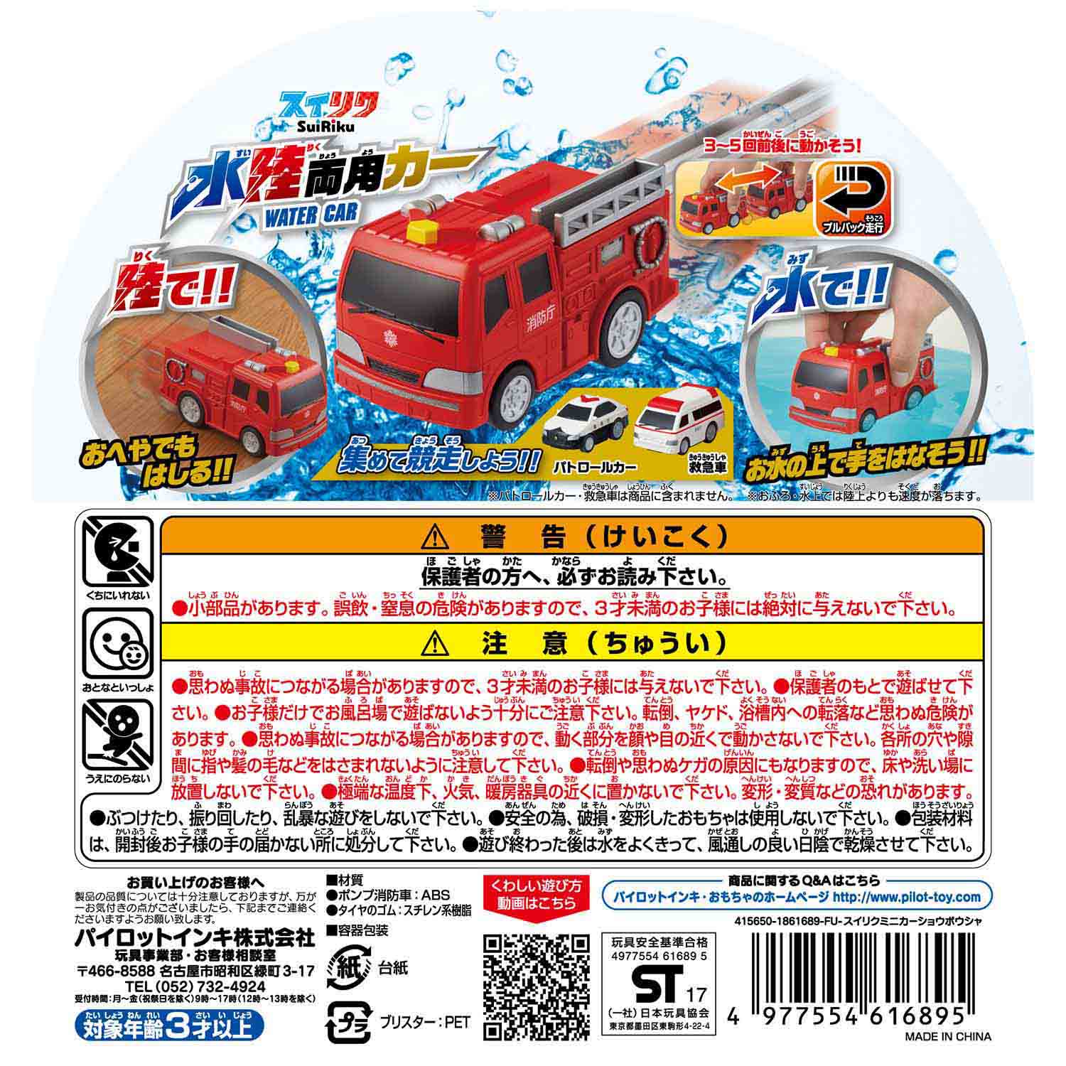 おふろでもお部屋でもプールでも遊べるポンプ消防車。 プルバック式のゼンマイが特徴の水陸両用のミニカーシリーズです。 電池不要のポンプ消防車です。 プルバック式のため前後に何回か往復させて離すと走り出します。 新機構搭載でおふろやプールでも進みます。お部屋でも走ります。