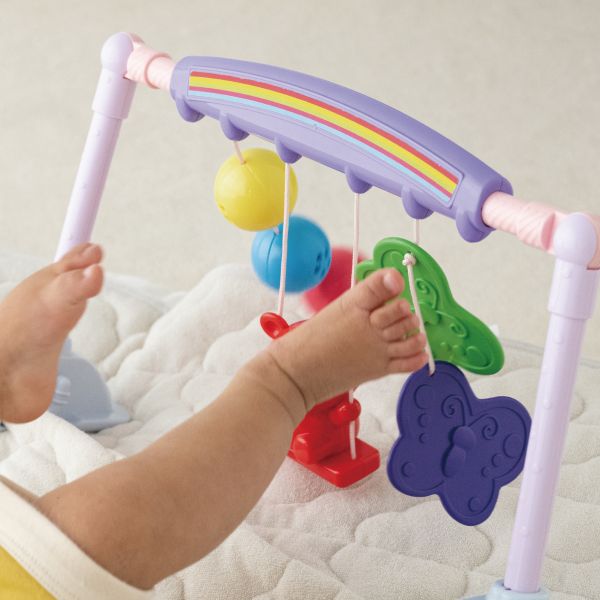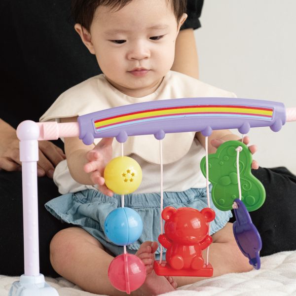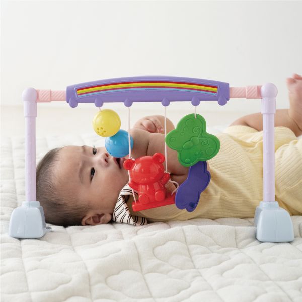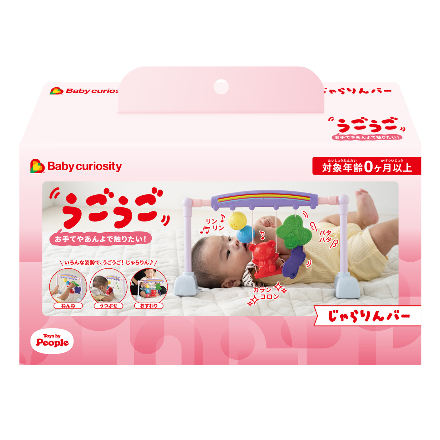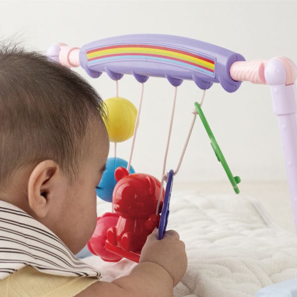 『うごうご』お手てやあんよで触りたい。 新生児のねんねの頃から、うつぶせ、おすわり、色んな姿勢でうごうご。じゃらりん。