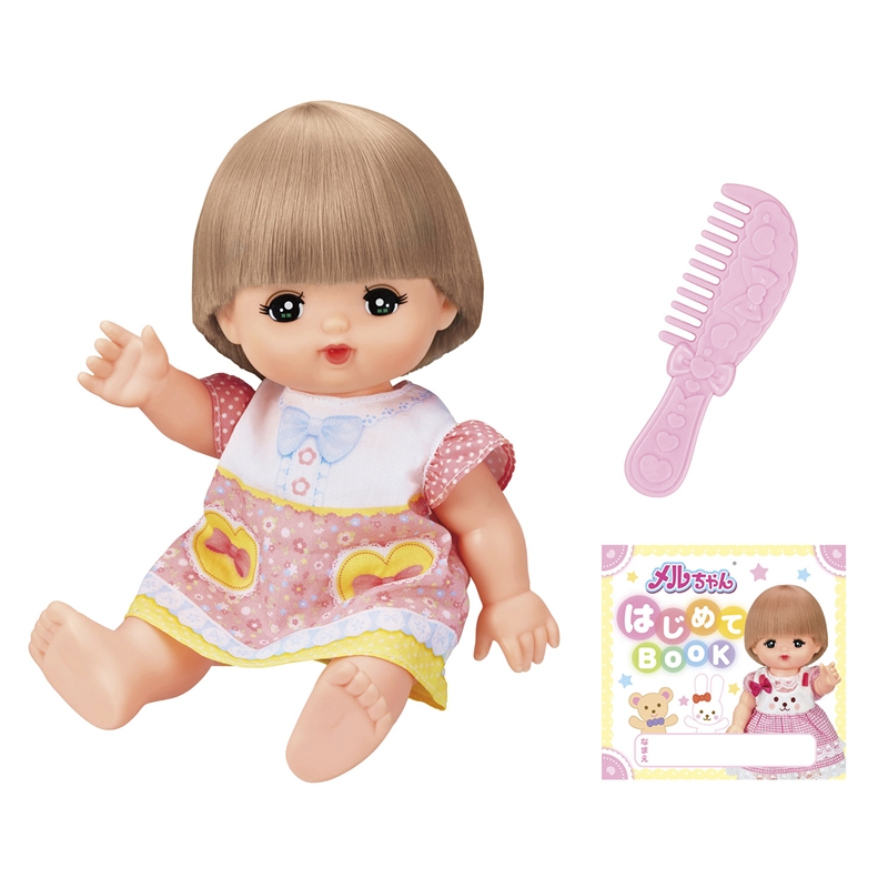 ●対象年齢:1.5歳~ ●セット内容:ショートヘアメルちゃん (はかせるおむつ付き)、ワンピース、くし 、はじめてBOOK ●材質:PVC、PP、ナイロン、PE、ポリエステル、綿、合成ゴム