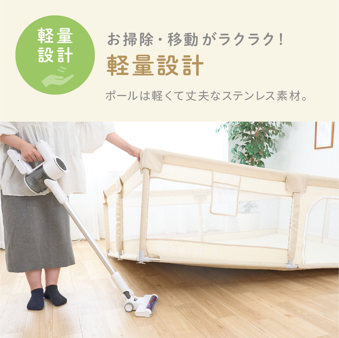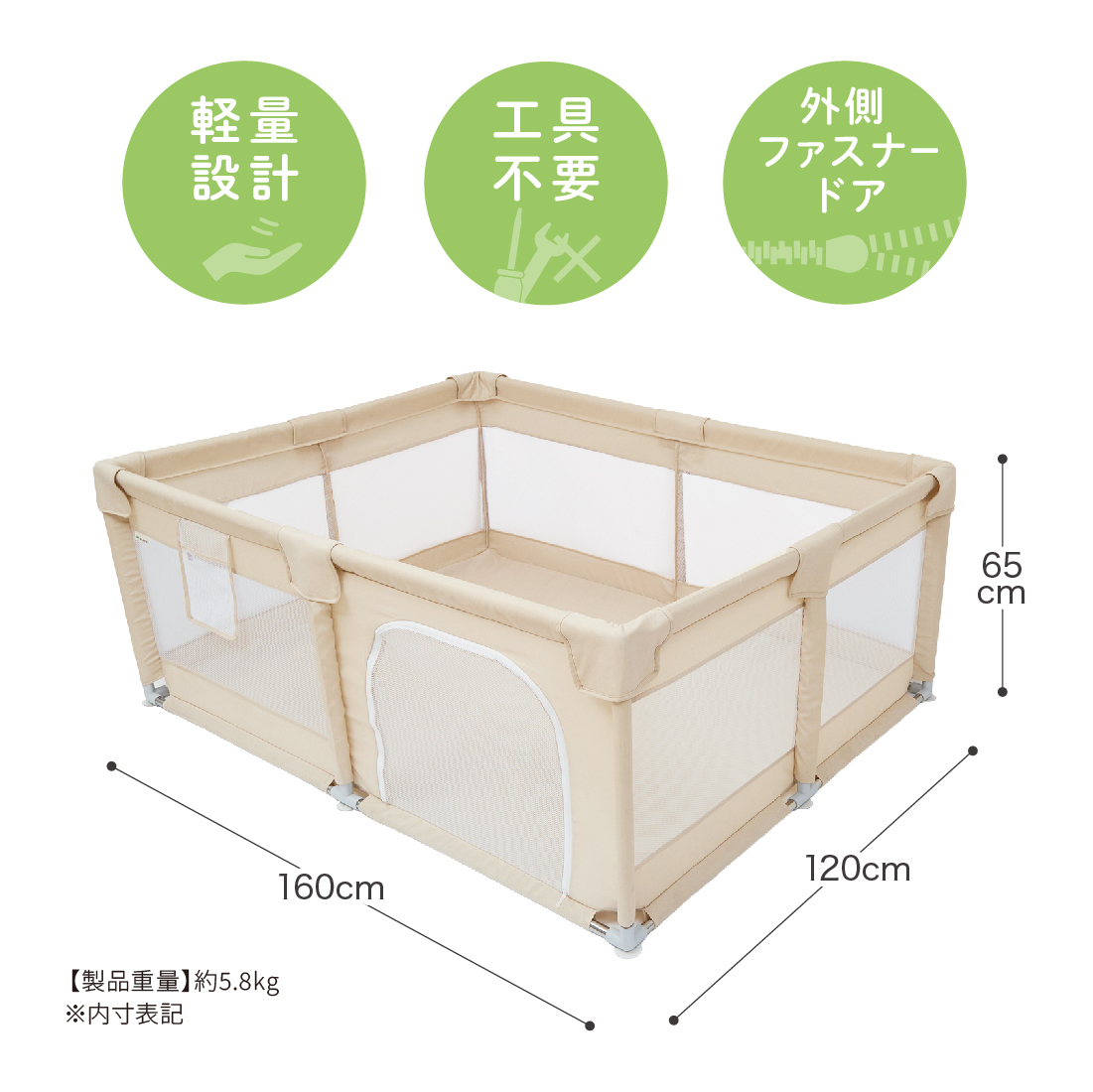 ●対象年齢:5ヵ月から~2歳 ●サイズ: [内寸]約160cm×120cm×65cm※ [外寸]約167cm×129cm×65cm※ [梱包サイズ]80cm×20cm×20cm ※ポールのジョイントパーツへの差し込み具合によって±3cm程度の誤差が生じます。 ●重量:[本体]約5.8kg ●素材: カバー:ポリエステル100% ポール:ステンレス クッション材:ポリウレタン ジョイント:ポリプロピレン ●付属品(セット内容): カバー1枚、収納袋1枚、 ポール(クッション無)8本 ポール(クッション有)16本 ジョイント(吸盤無)6個 ジョイント(吸盤有)8個 取扱説明書 (C)kerata