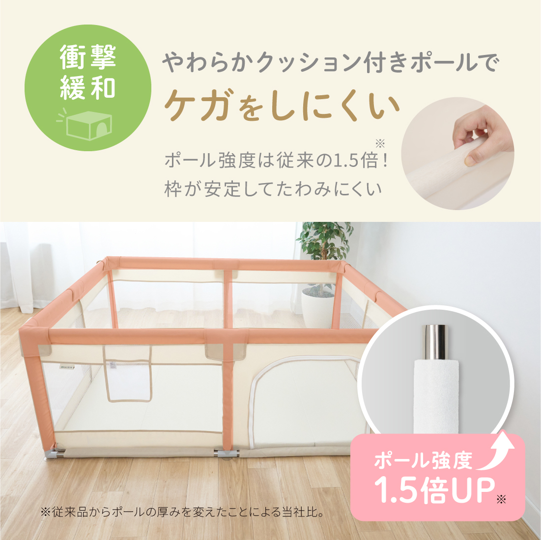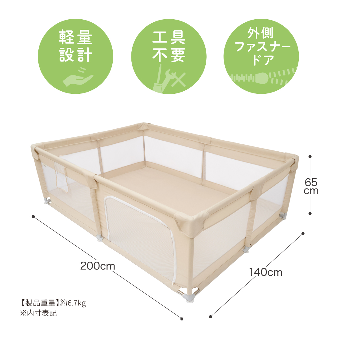 ●対象年齢:5ヵ月から~2歳 ●サイズ: [内寸]約200×140×65cm※ [外寸]約210×148×65cm※ [梱包サイズ]100cm×20cm×20cm ※ポールのジョイントパーツへの差し込み具合によって±3cm程度の誤差が生じます。 ●重量:[本体]約6.7kg ●素材: カバー:ポリエステル100% ポール:ステンレス クッション材:ポリウレタン ジョイント:ポリプロピレン ●付属品(セット内容): カバー1枚、収納袋1枚、 ポール(クッション無)8本 ポール(クッション有)16本 ジョイント(吸盤無)6個 ジョイント(吸盤有)8個 取扱説明書 (C)kerata