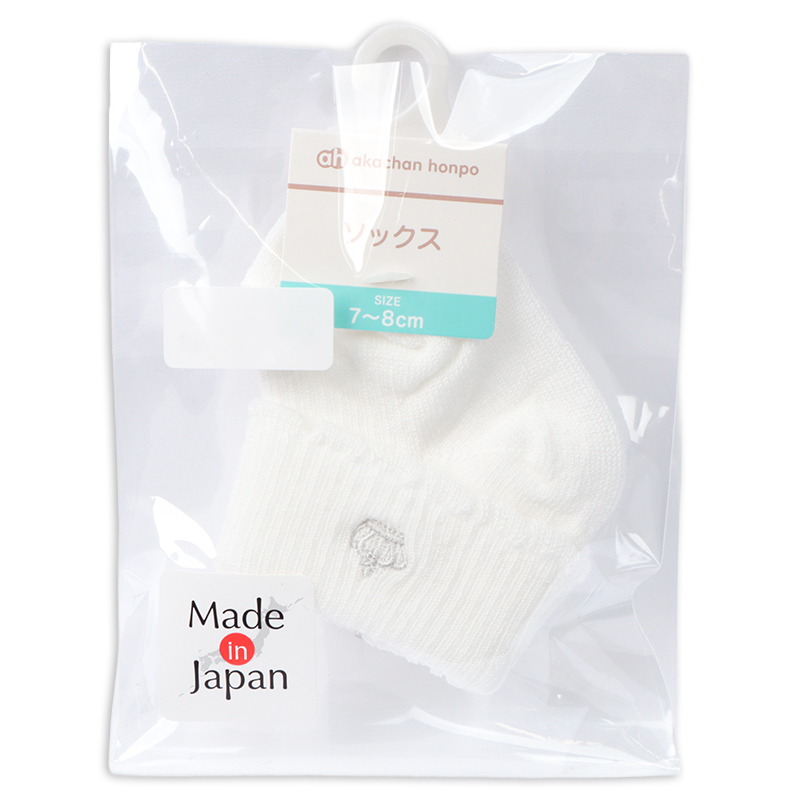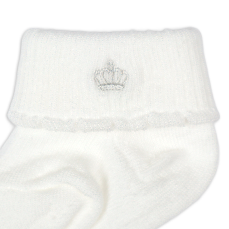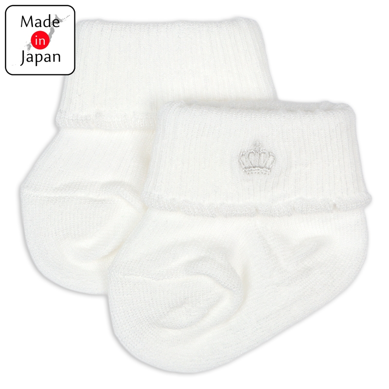 退院時やお宮参り、お披露目会などのセレモニーにもご使用いただける、国産新生児用のくつしたです。 折り返し部分にクラウン刺繍を施し、ピコがついている上品で可愛らしいデザインが特徴です。 シンプルなデザインでどんな服装にも合わせやすいです。