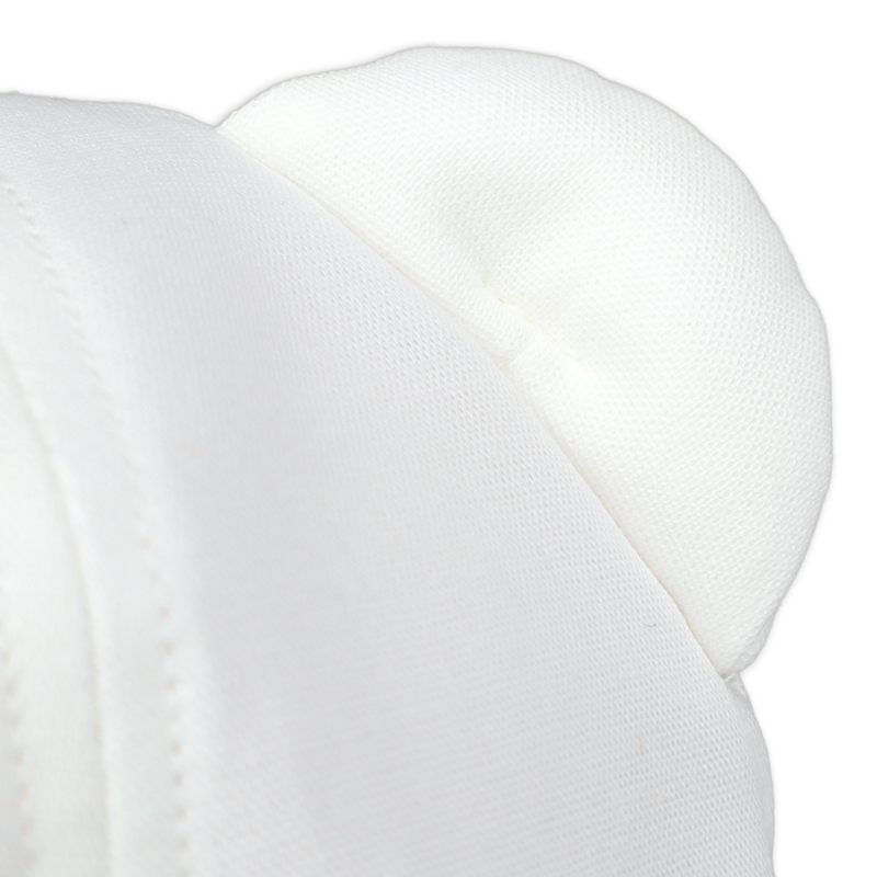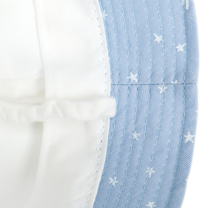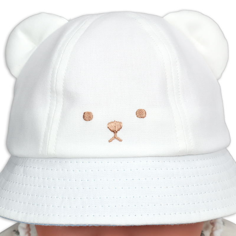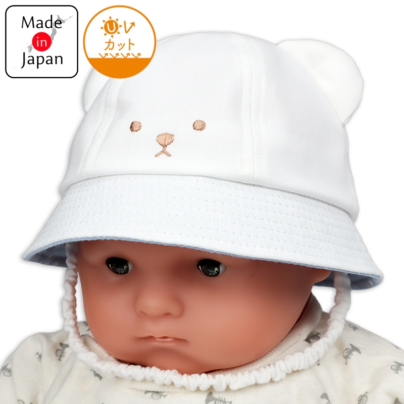 くまの顔の刺繍とくまの耳がとってもかわいい帽子です。 つばの裏側は星柄になっています。 UVカットの数値も高く日差しが気になるお外では紫外線対策としてもおすすめです。 風に飛ばされてしまうのを防ぐあごゴムには赤ちゃんの肌に優しい綿素材でゴムを包んだものを使用しています。 一枚一枚丁寧に作られた日本製です。
