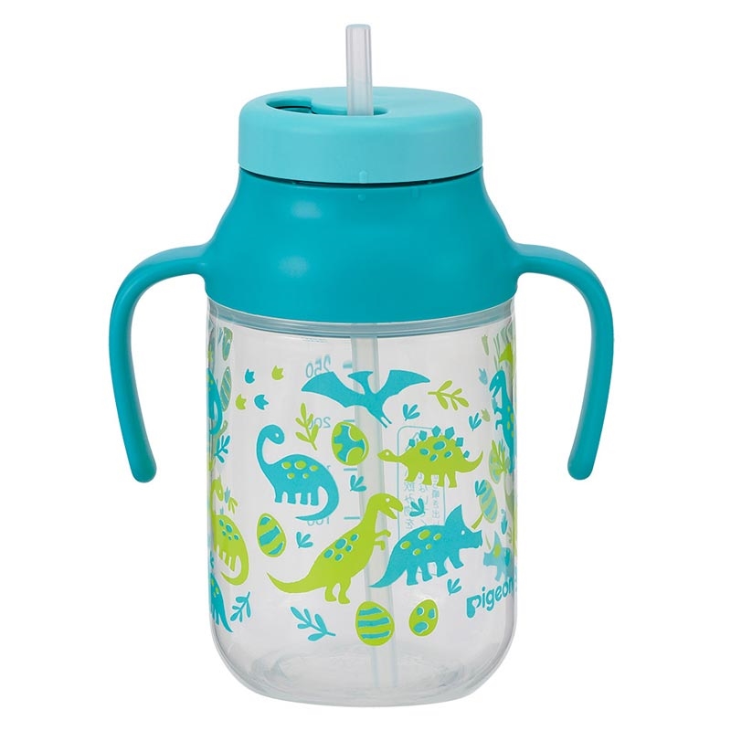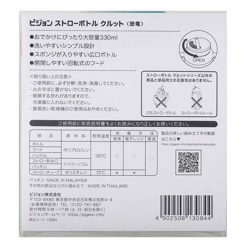 クルッとまわしてストローの出し入れをする新仕様。 商品特長 Point1:おでかけにぴったり。 ・大容量330ml(ボトル容量:390ml 最大目盛:330ml) ・お好みに合わせやすい豊富なラインナップ Point2:お手入れラクラク ・スポンジが入りやすい広口ボトル(口径面積が当社従来品の約1.3倍) ・部品が少ないシンプル設計 部品点数は6点(ボトル、フード、ハンドル、ストロー飲み口、パッキン、ストローチューブ)。シンプル設計だから、洗いやすくて、分解・組み立てのお手入れもカンタン。 Point3:かんたんに使える。 ・開閉しやすい回転式フード クルッとまわすだけで簡単にストローの開閉ができるフード。マークもあるので正しい位置で開閉しやすい。 ・消毒 ストローチューブは薬液のみ。 その他は煮沸・電子レンジ・薬液全対応。
