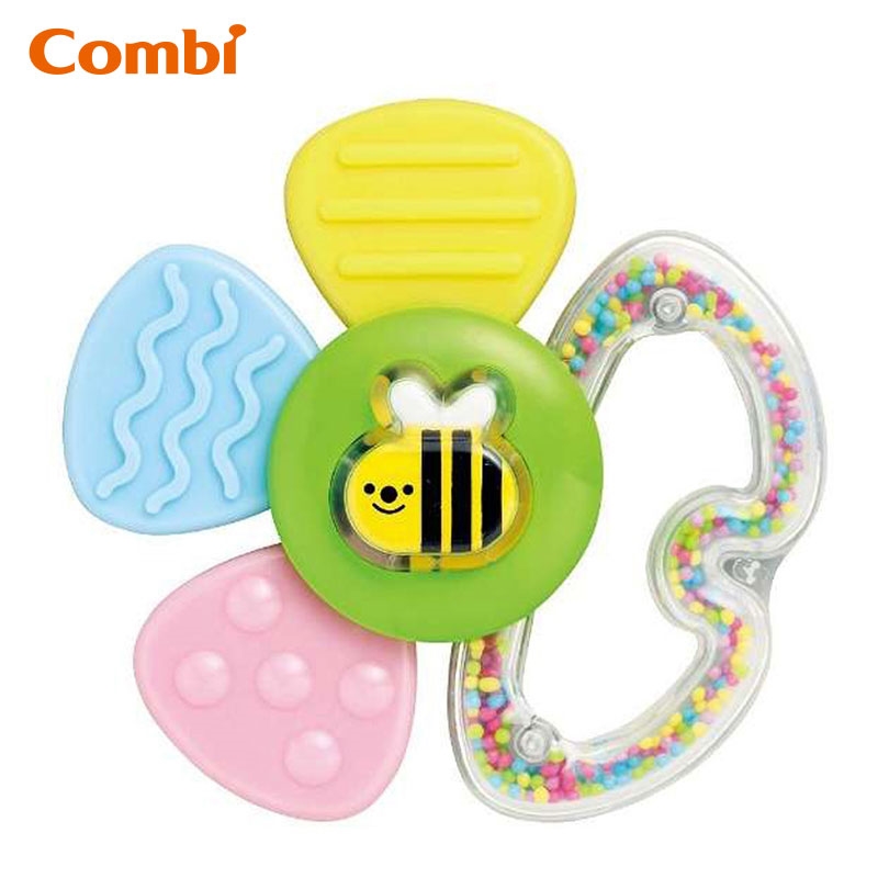 手に持って振るとビーズのシャカシャカ音がしておもちゃとしても遊べる便利な歯がためです。 歯がため部分は3種類の模様があって、かみごこちもいろいろ楽しめます。 やさしい4色のカラーの本体にハチのデザインがかわいいと人気です。 持ちやすくて、さっと水洗いができる、お手入れも簡単な歯がためです。