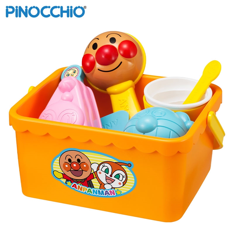 アンパンマンと仲間たちをモチーフにしたアイスやケーキを砂で作って楽しむことができます。 小物は全てバケツに収納できます。 砂型など10アイテムが入っています。