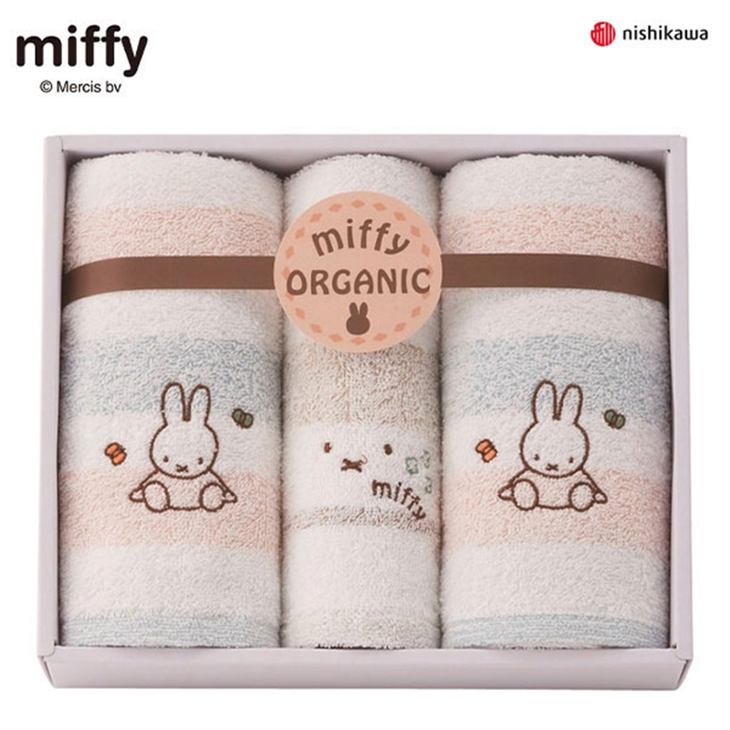 シンプルなボーダーにミッフィーの刺繍がアクセント。 パイルにはオーガニック100%の糸を使用しています。