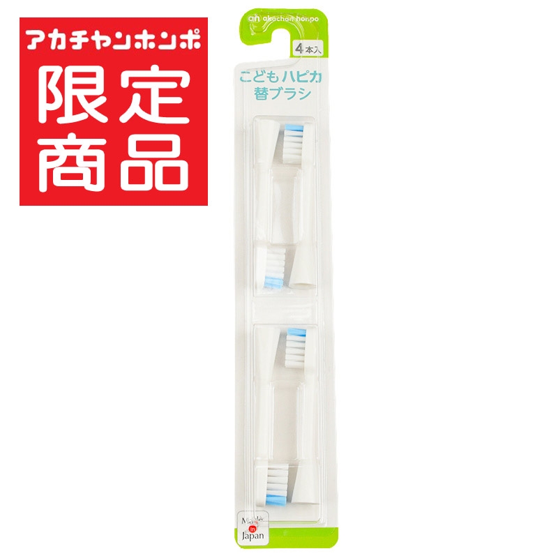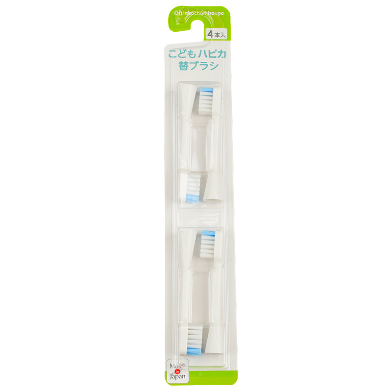 歯と歯ぐきにやさしい毛先丸加工。 しっかりみがけるコンパクトヘッド。 【替ブラシ】こども用 4本/パック 互換性がございますので全てのハピカシリーズに装着が可能です。 ●特長 ・歯と歯ぐきにやさしい毛先が丸加工 ・コンパクトヘッドなので小さなお口でも綺麗に磨けます 正しい歯みがきのため、ブラシが傷んだら早めに交換しましょう ●ブラシの寿命と交換の目安 ・毛先が開いた時 ・毛の部分が汚れた時 ・毎日2回以上の使用で1ヶ月が過ぎたら ●使用上の注意 ・本体の取扱説明書に従ってご使用ください ・保管の際は小さなお子さまの手が届かないところに保管してください。 ・お子さま1人でのご使用は誤ってのどをついたりする等の重大な事故につながる恐れがあります。 十分に注意の上必ず保護者の方が同伴し、保護者の方がみがいてあげてください。 ※画像はイメージです。商品と仕様が異なる場合がございます。