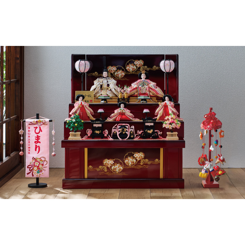 茜色に黒ぼかしを施した光沢のある収納箱と雪輪に桜と楓の金彩が高い格調を感じさせます。 金糸の豪華な金襴衣裳が茜色の屏風に映える、華やかな雰囲気のお人形です。 光沢のある背景に、雪輪に桜と楓の金彩を施した上品で高級感のある屏風です。 引き出し式の三段収納箱です。