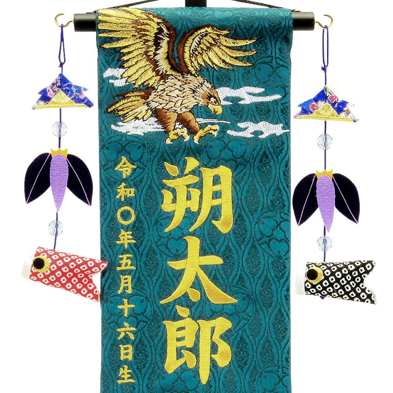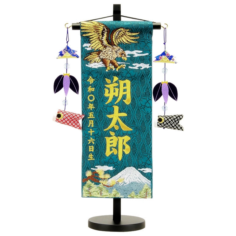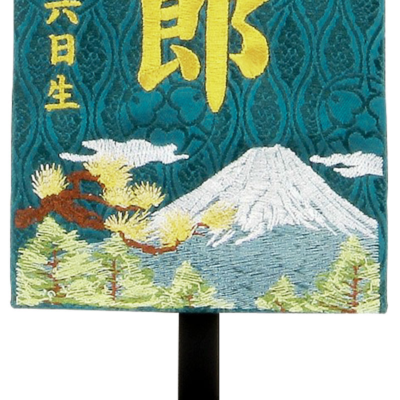 富士山と鷹の絵柄を刺繍で施しました。 兜飾りと一緒にお飾り頂けます。 お子ささまのお名前、生年月日が刺繍で入ります。 ※名入れにはサイン楷書体を使用しています。 ※ゴシック体表記の文字と一部異なる場合もありますので予めご了承ください。 ※年号は「令和●年」で表記されます。 令和1年は、「令和元年」で表記されます。予めご了承下さい。 ※詳細画像の兜飾りと鯉飾りは商品に含まれません。飾りイメージとなります。予めご了承下さい。 ※実際の商品と画像は若干異なる場合がございます。