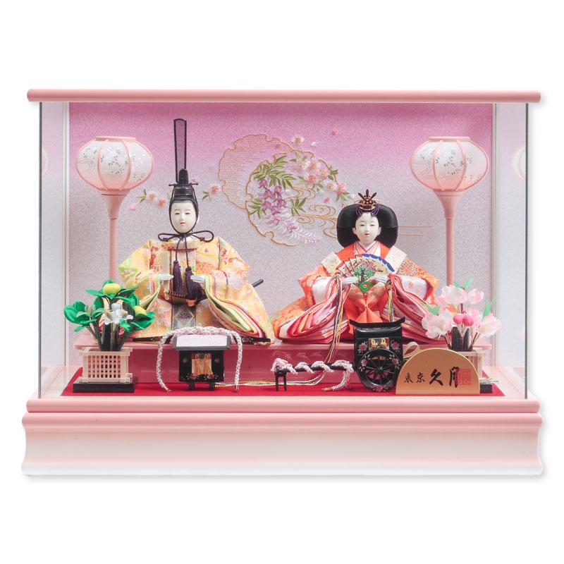 おだいり様の衣裳とおひな様の重ねを淡い色でまとめ、肩帯には桜柄の金彩加工を施しました。 背景に華やかな桜と豊かな成長を願う雪輪文様の刺繍を施しました。 ケースにオルゴールが付いています。ケースはガラス素材(透明、傷が比較的つきにくい)を使用致しました。 お子様の幸せが末永く続くことを願って。