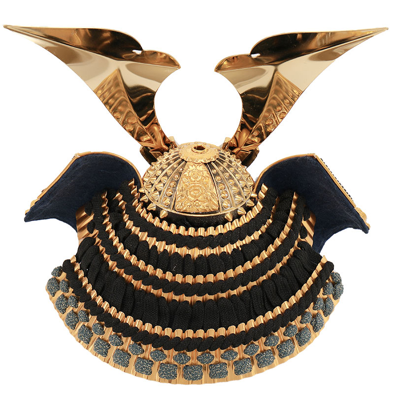 落ち着いた雰囲気の木目の屏風と収納箱が、大鍬形の兜をより一層引き立てる、兜収納飾りです。
