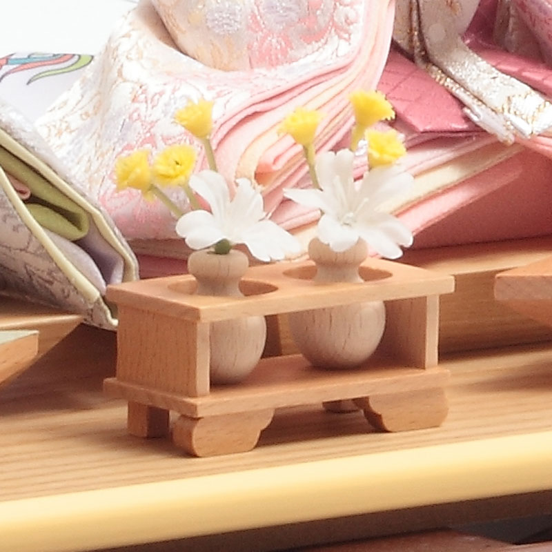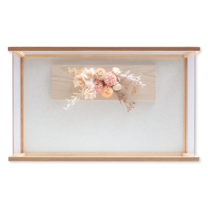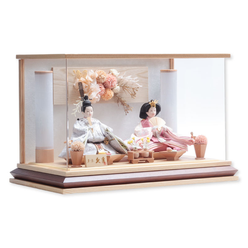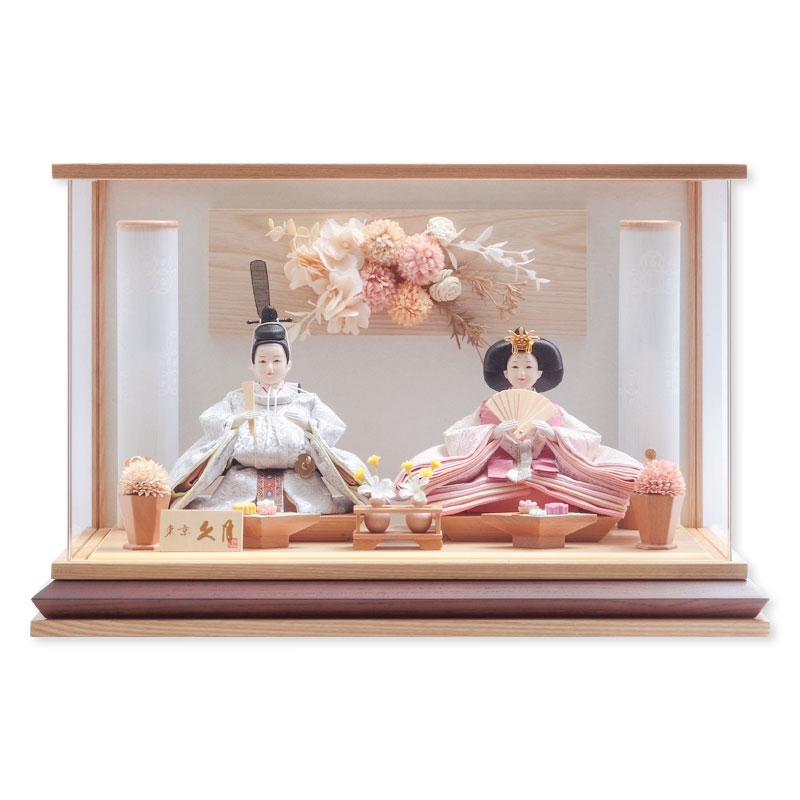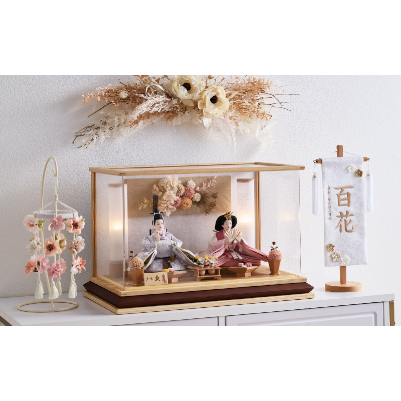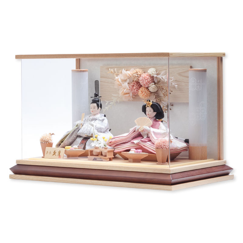 木目を活かしたアクリルケースに、咲き誇る花が全体を彩るかわいらしい親王ケース飾りです。